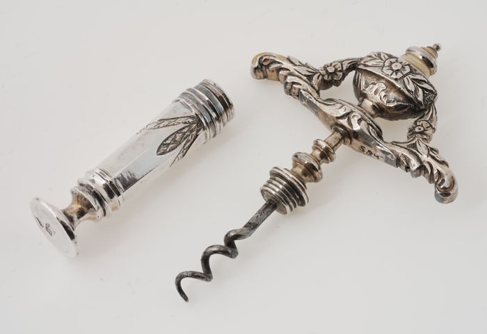 Zilveren kurkentrekker met afbeelding dekselvaas, in...