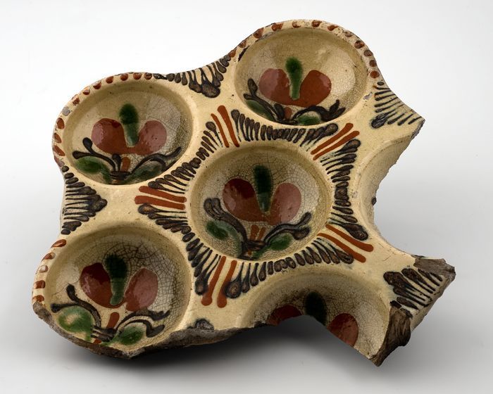 Wit aardewerken eierpan met wit glazuur met rood, bl...