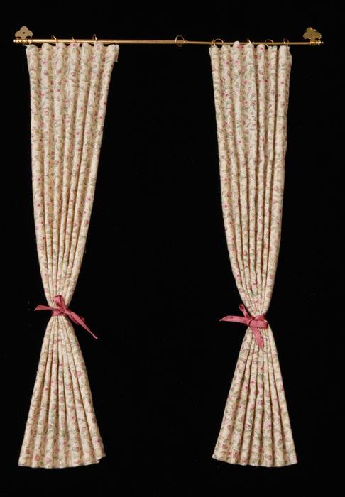Paar roomwitte gebloemde geplooide miniatuur gordijn...