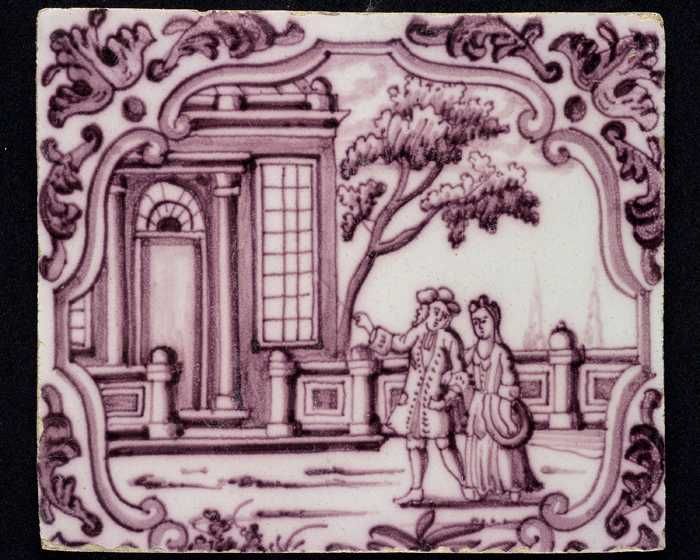 Tafereeltegel, dame en heer bij theehuis, hoekmotief...