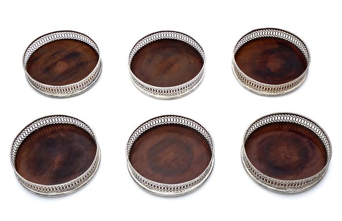 Zes ronde zilveren flessenbakken met openwerkte randen