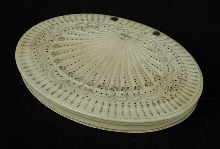 Platte ovale poederdoos van bewerkt ivoor, scharnier...