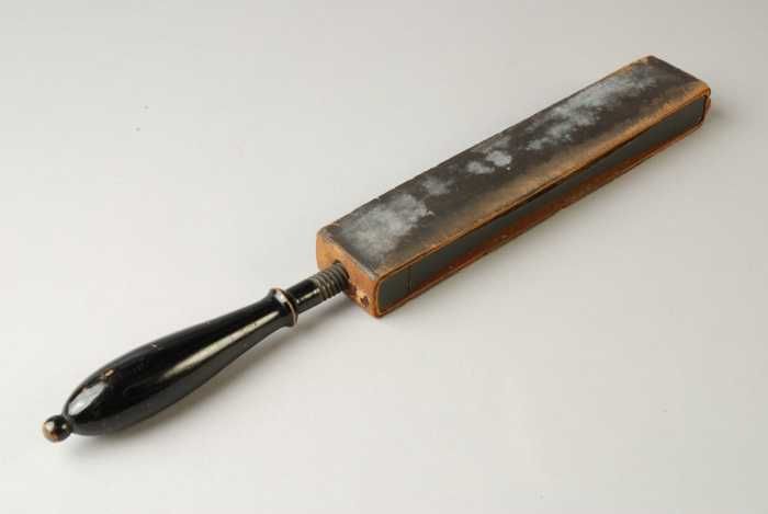 Aanzetriem, zwart gelakt houten handvat en met leer ...