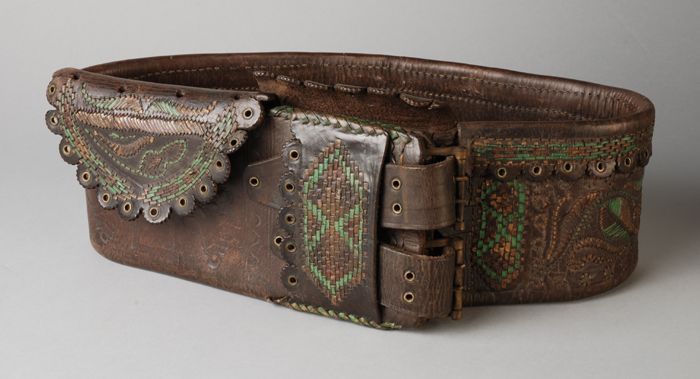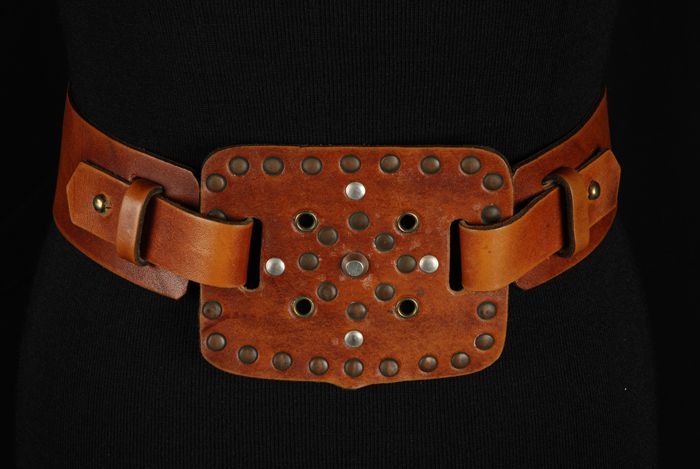 Brede ceintuur van bruin leer, middenvoor een breed ...