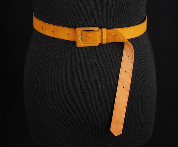 Smalle ceintuur van okergeel suède met een rechthoek...