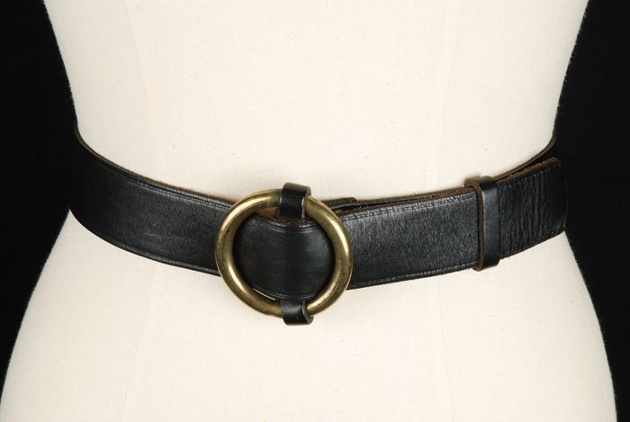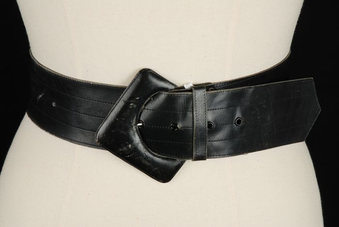 Brede ceintuur van dik zwart geverfd leer, ronde kop...