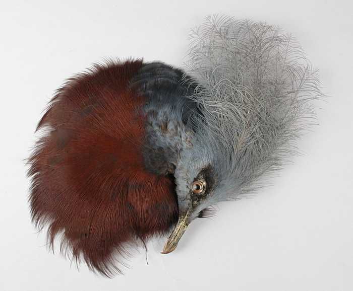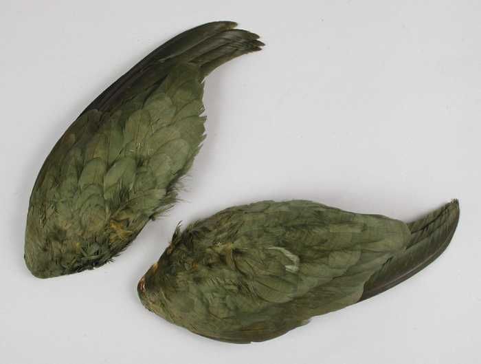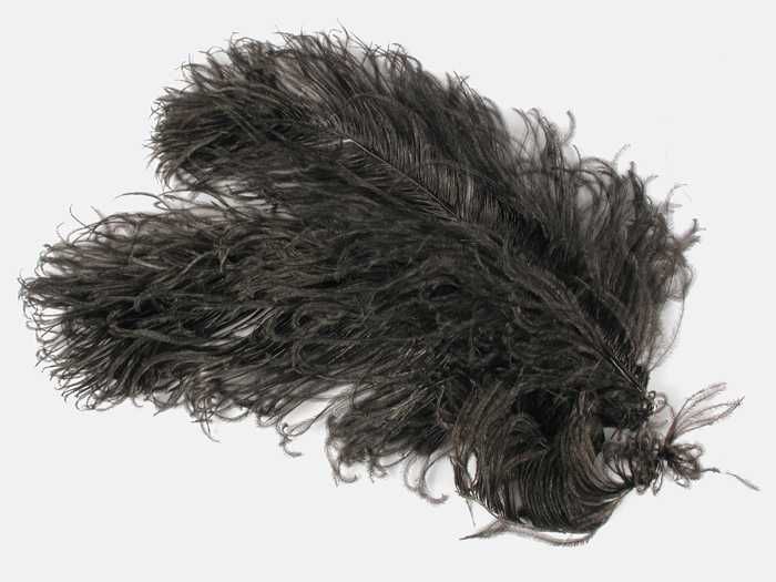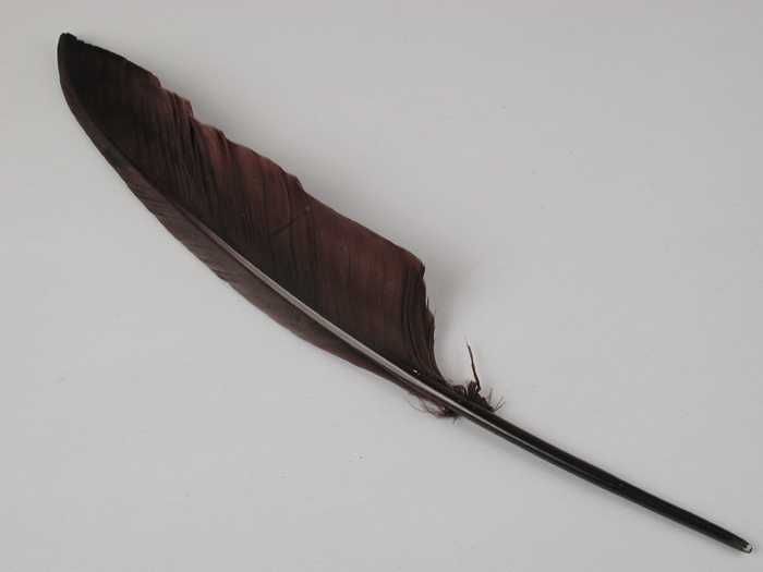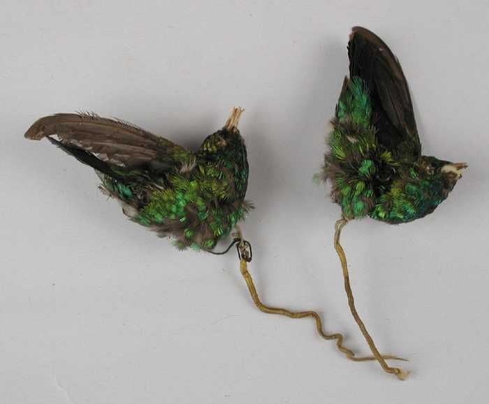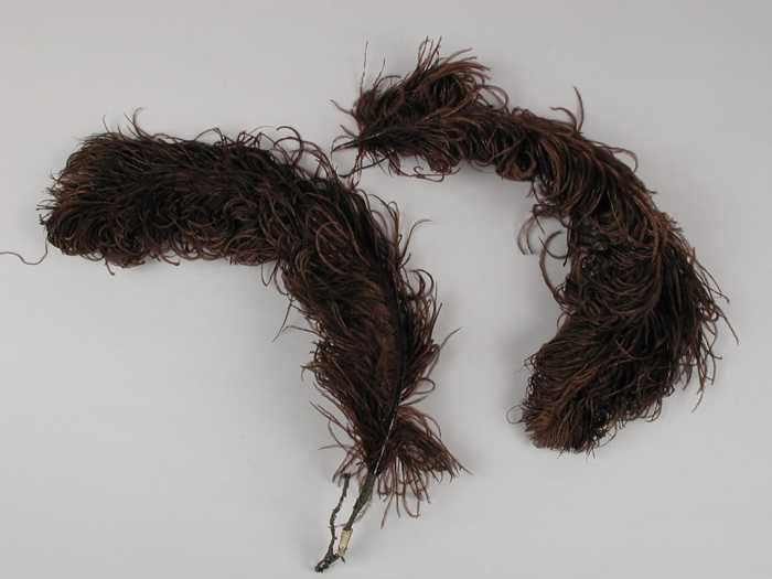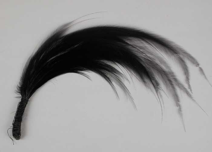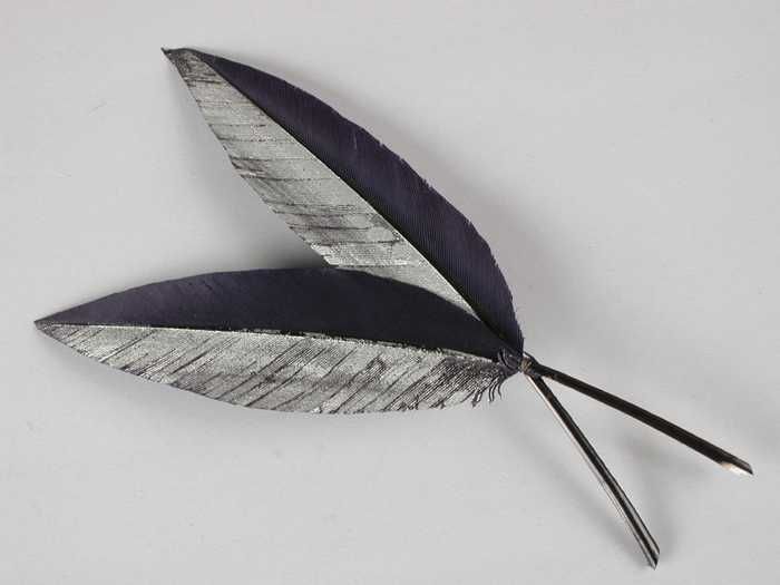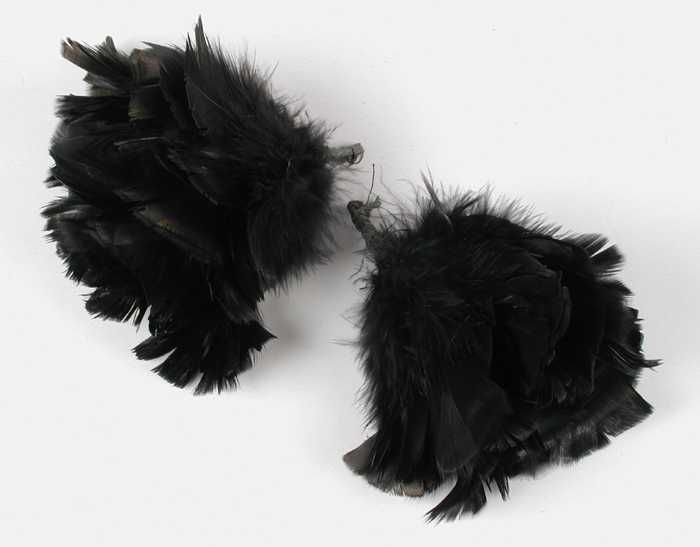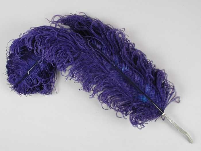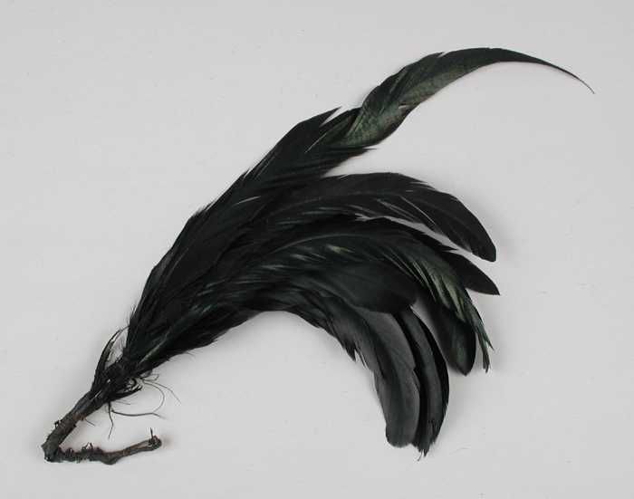 Verendecoratie, twee donkerblauw geverfde veren aane...
