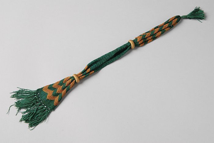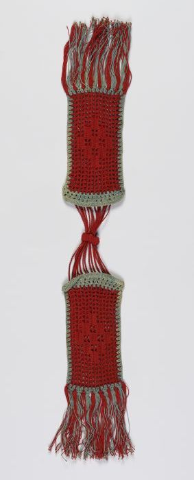 Kousenbeurs, filethaakwerk in rood en groen garen, t...