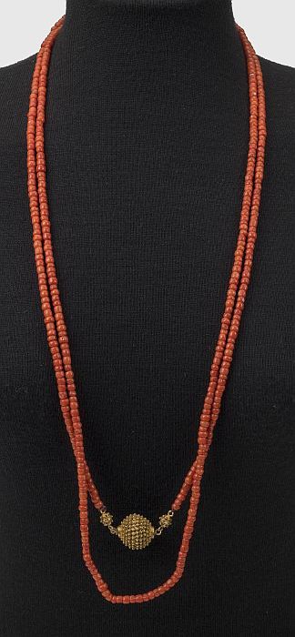 Bloedkoralen kralensnoer met twee strengen van staaf...