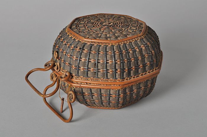 Handtas of korfje van wilg en linnen band, twee scha...