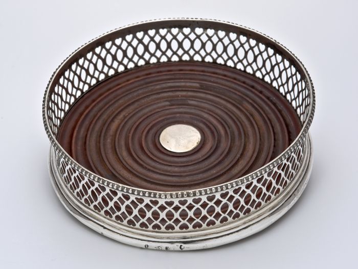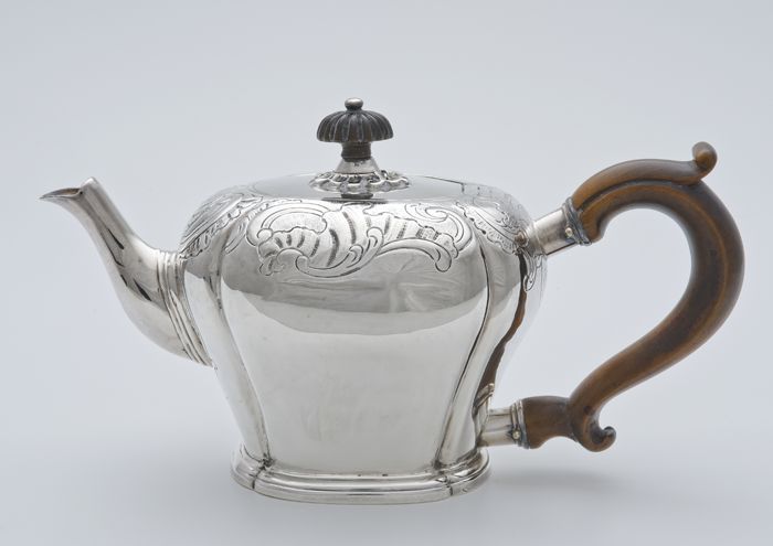 Zilveren theepot met bruine knop en oor
