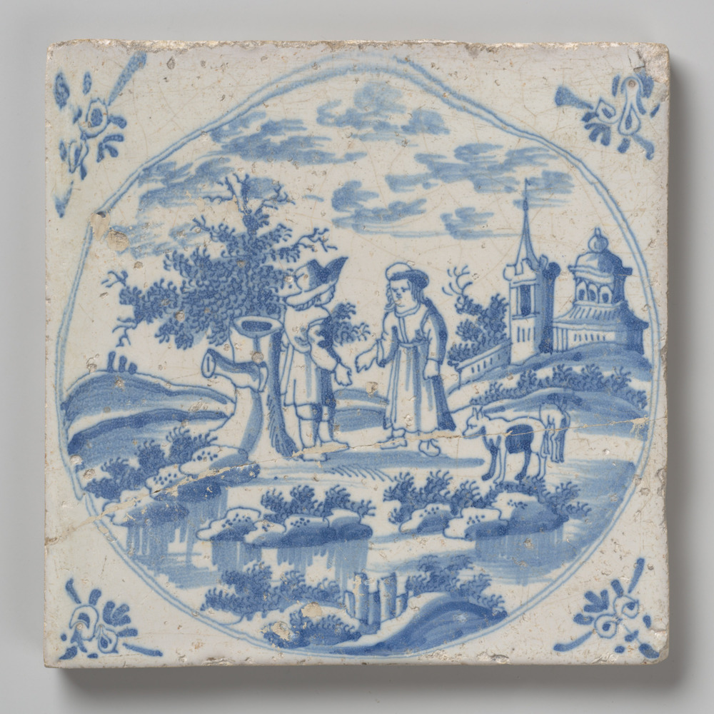 tegel van keramiek met tinglazuur, voorstellende: De...