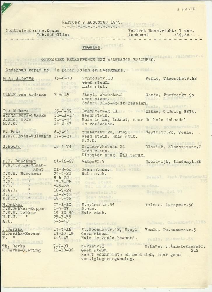 Rapport 7 augustus 1945 bezoek Tegelen door J. Schel...