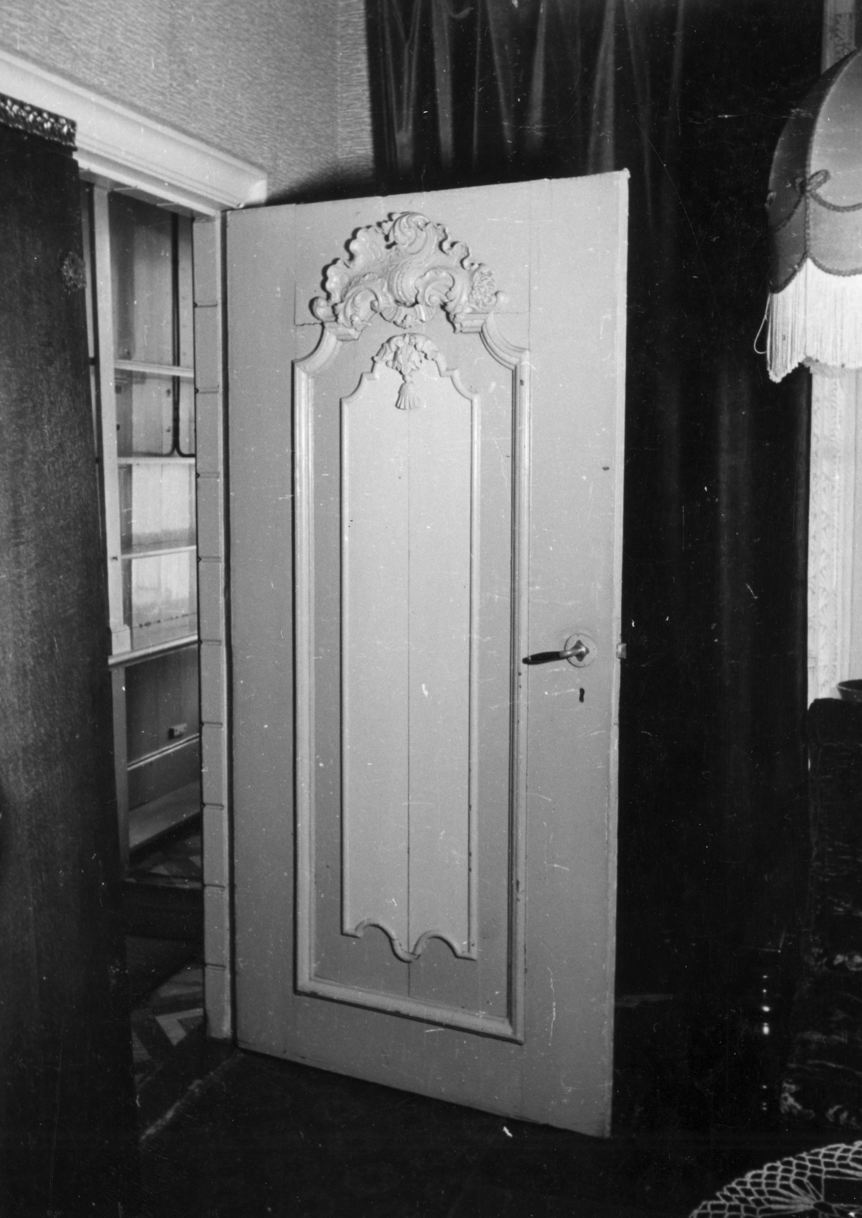 Deur met snijwerk, Workum, 1944 (zwart-wit foto)