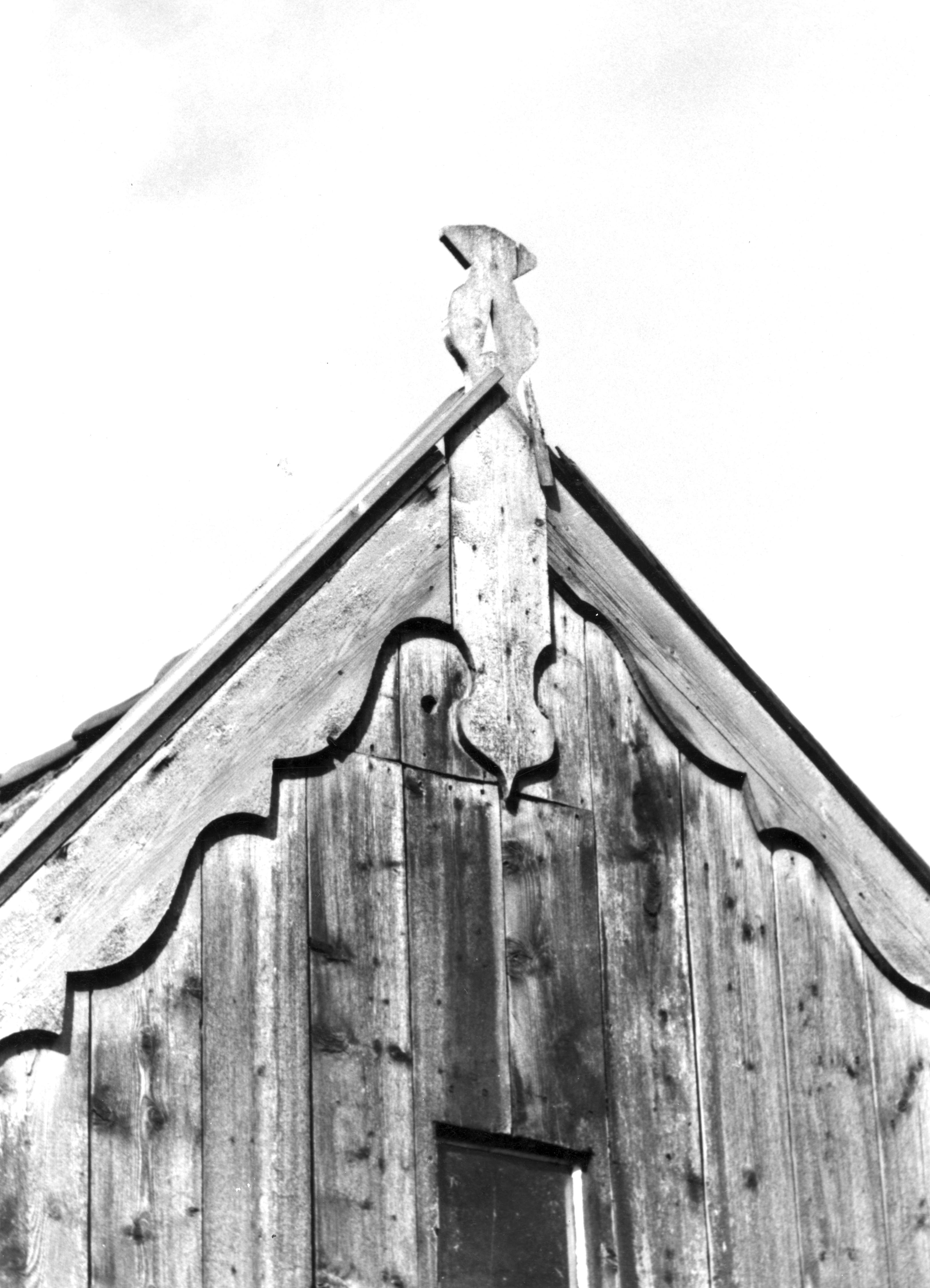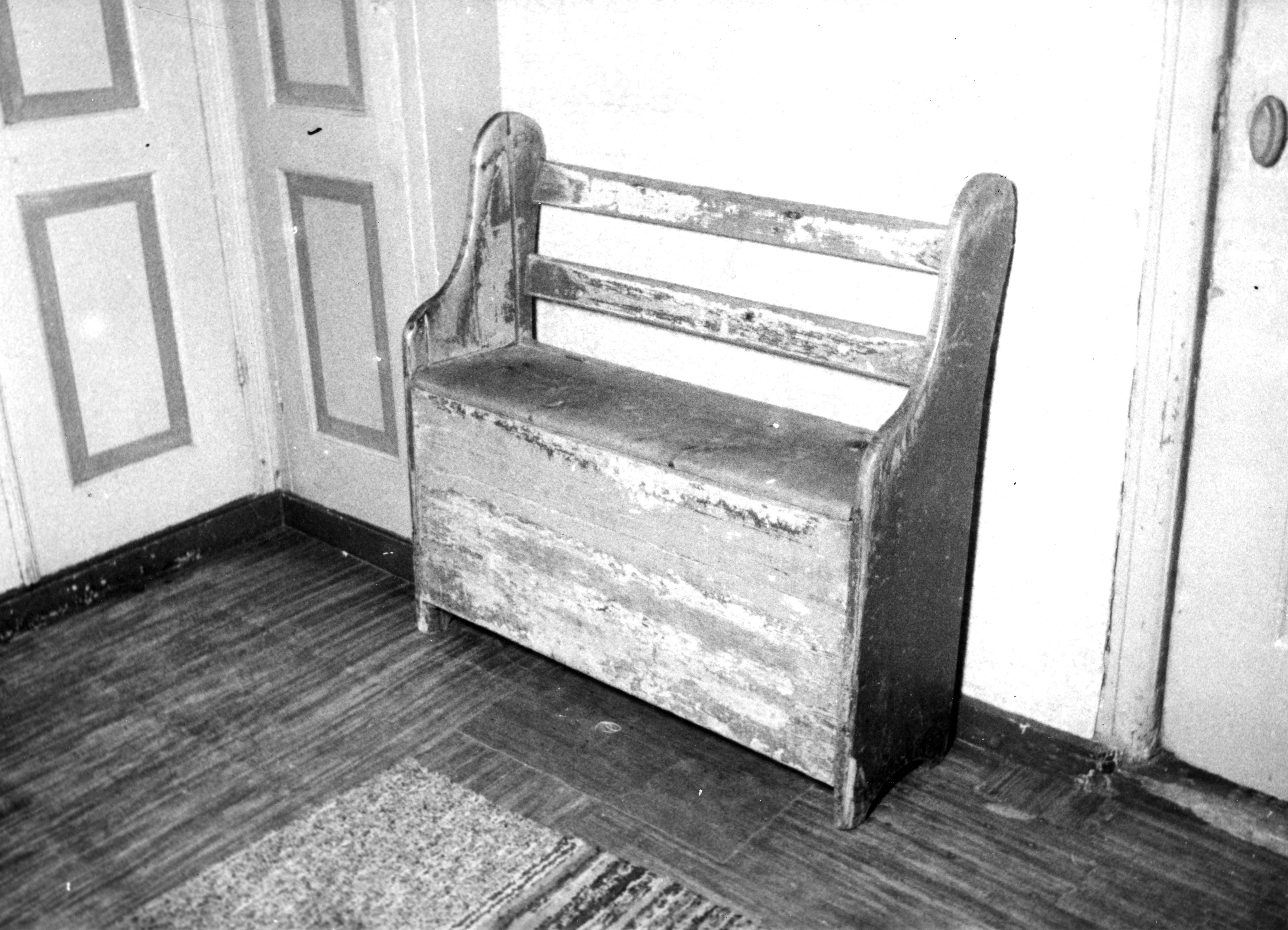 Bankje met houtsnijwerk, Workum, 1944 (zwart-wit foto)
