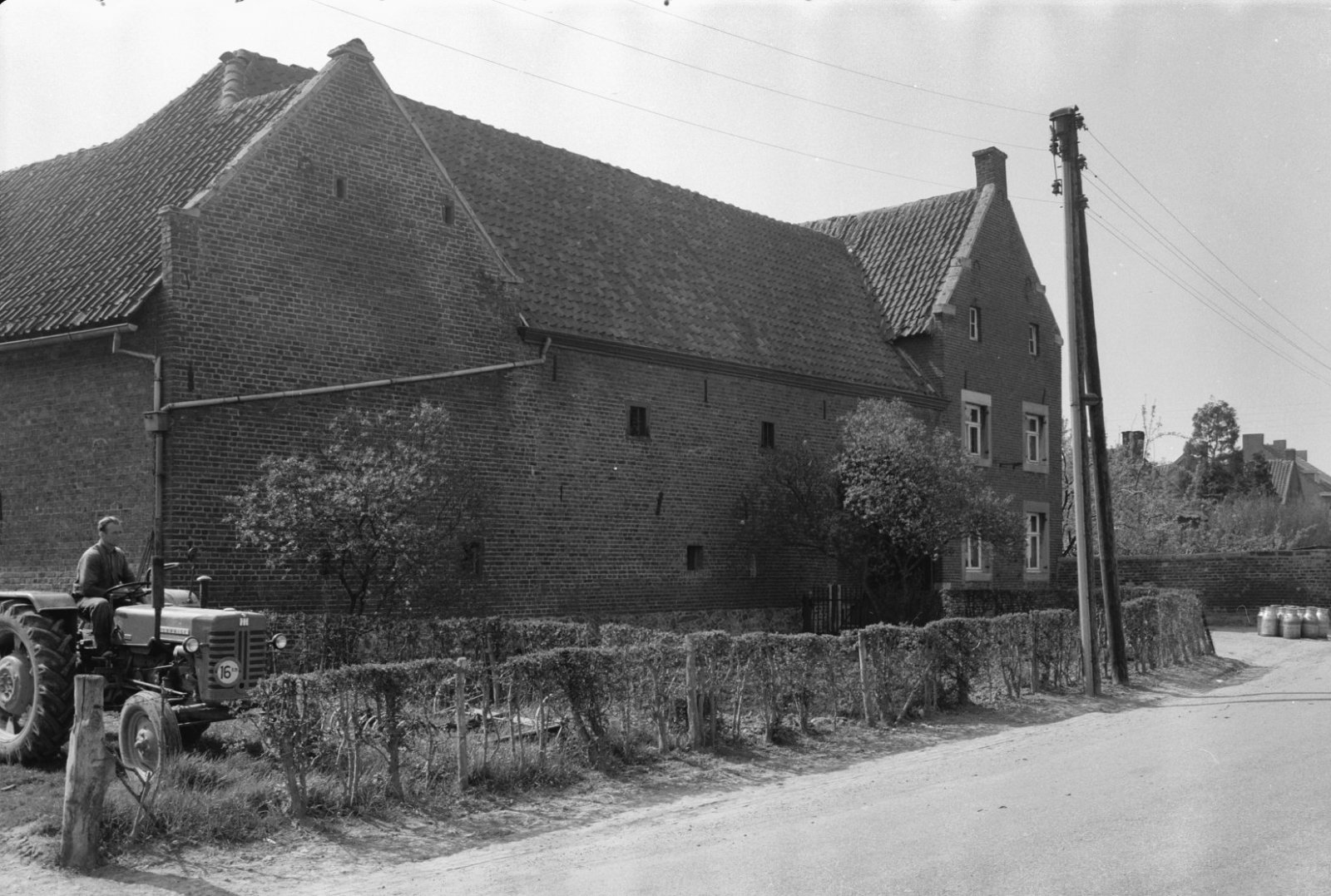 Boerderij met melkbussen aan de weg, boer op tractor...