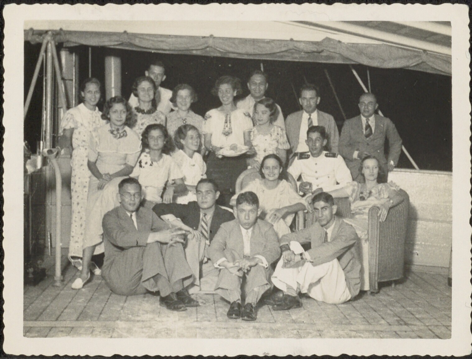 Groepsportret aan boord van een schip