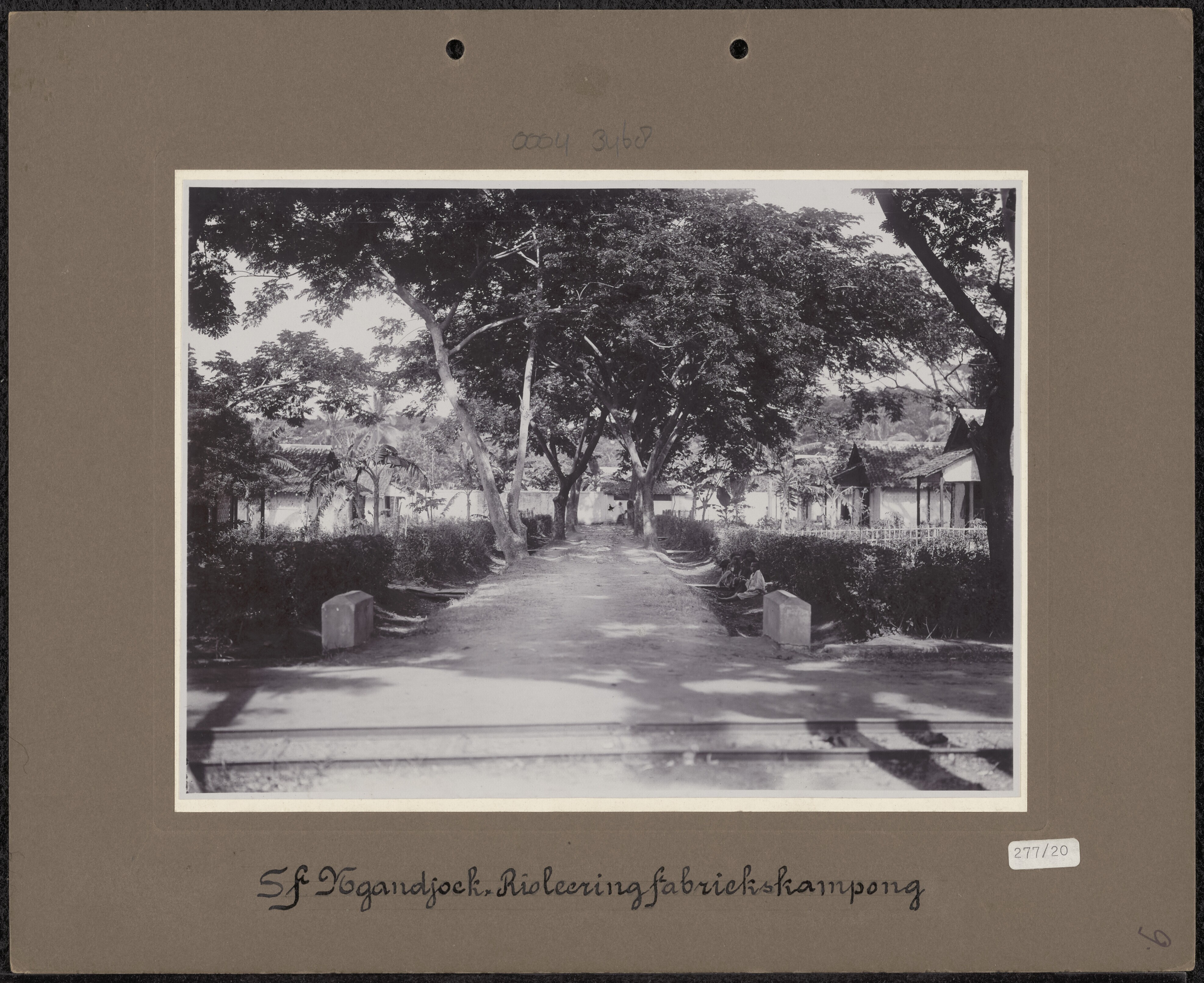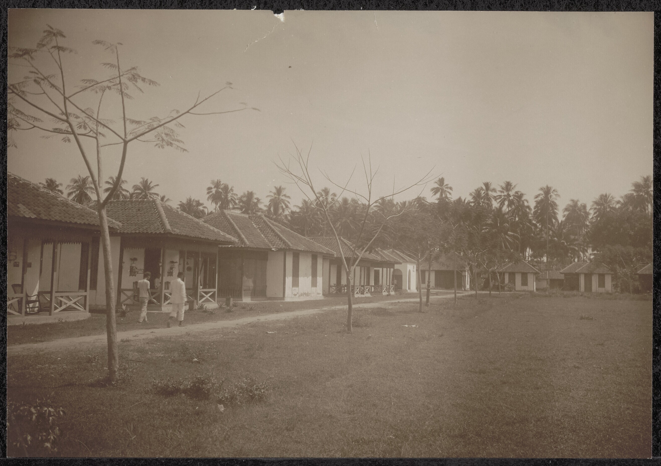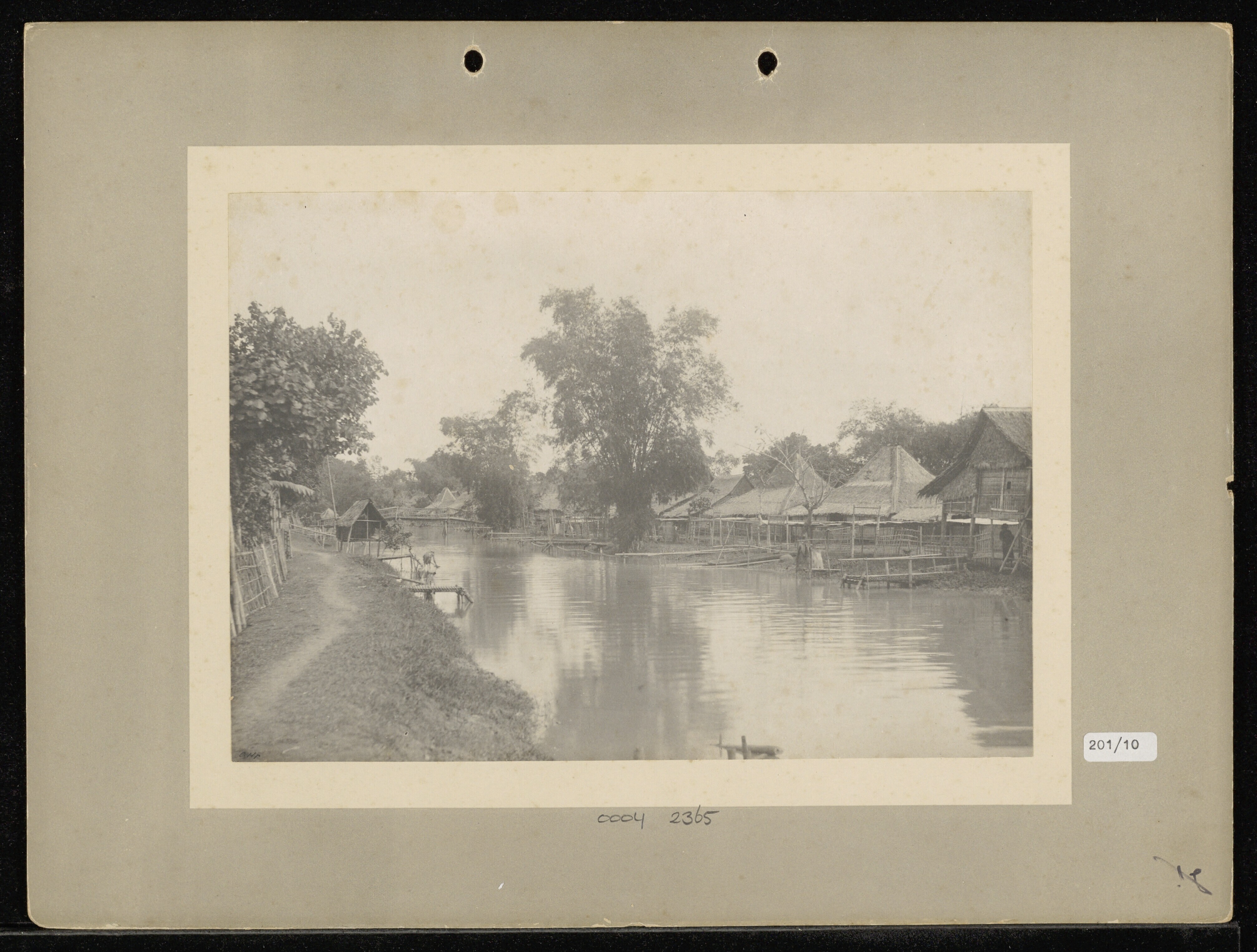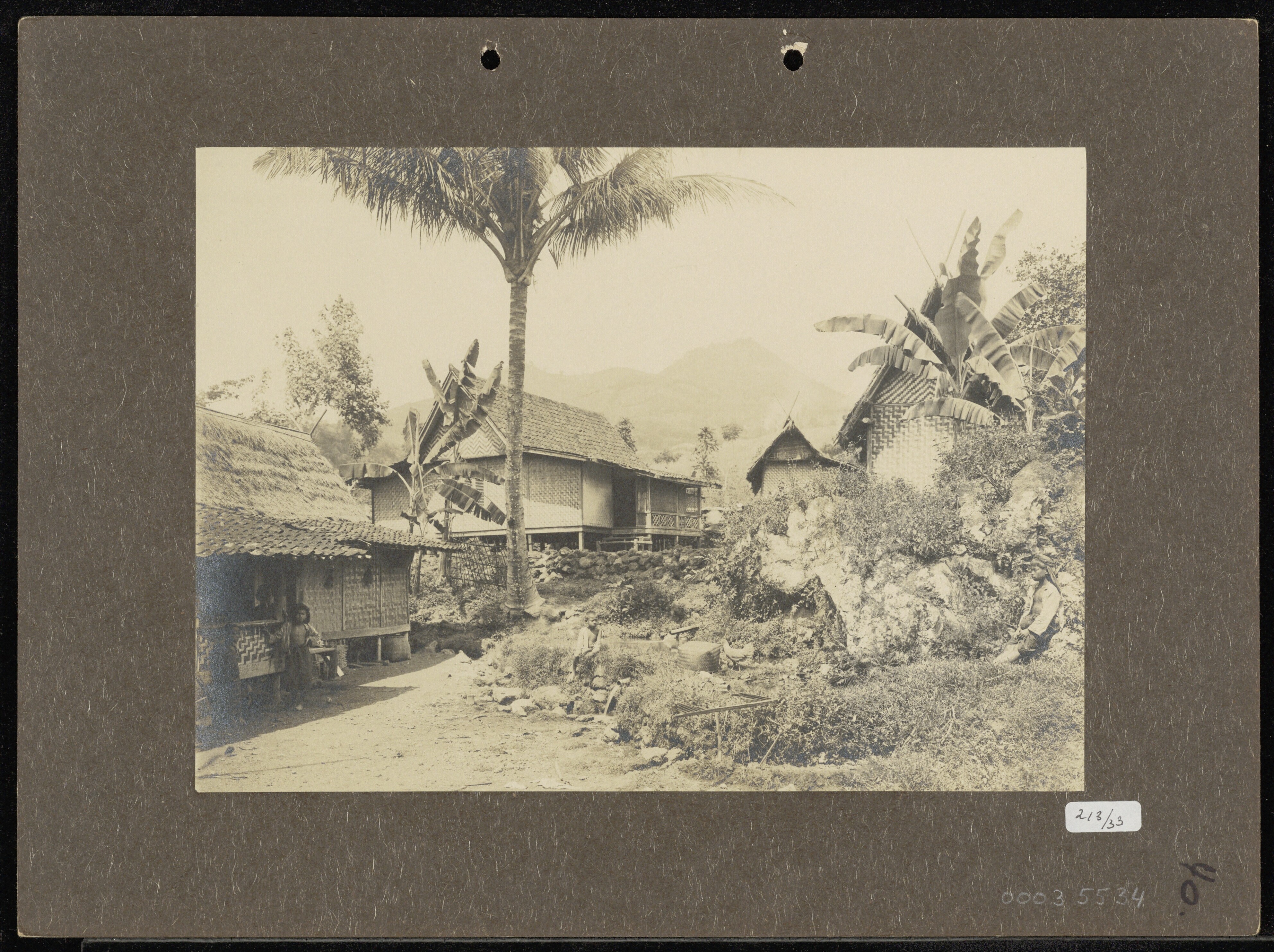 Ingang van een dessa met Javaanse (?) mannen en bote...