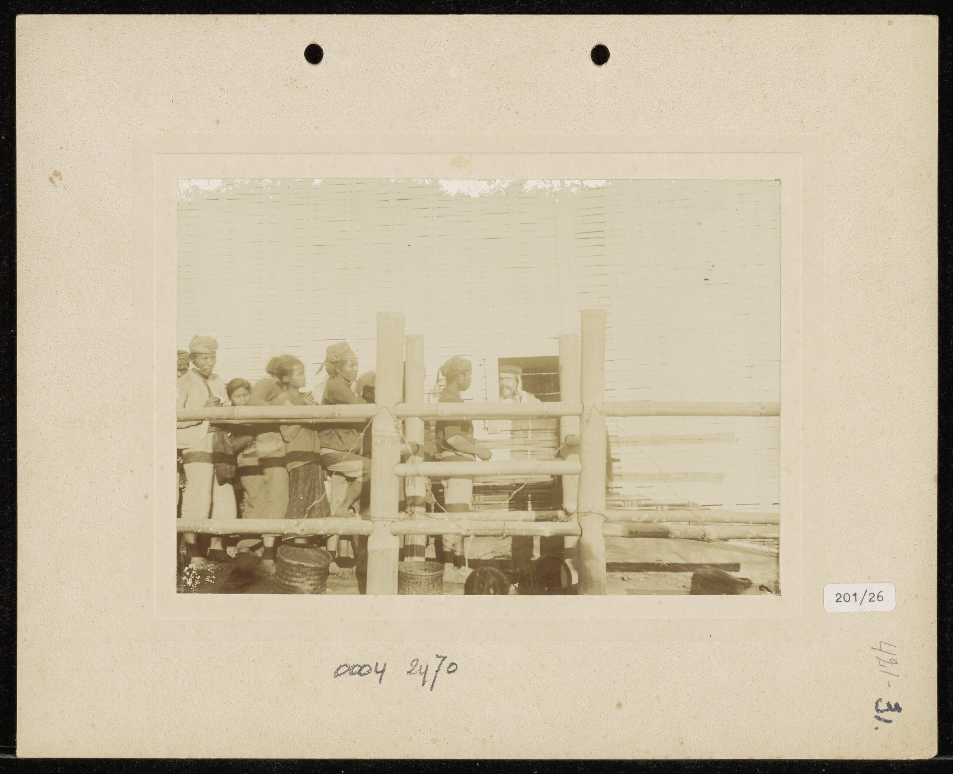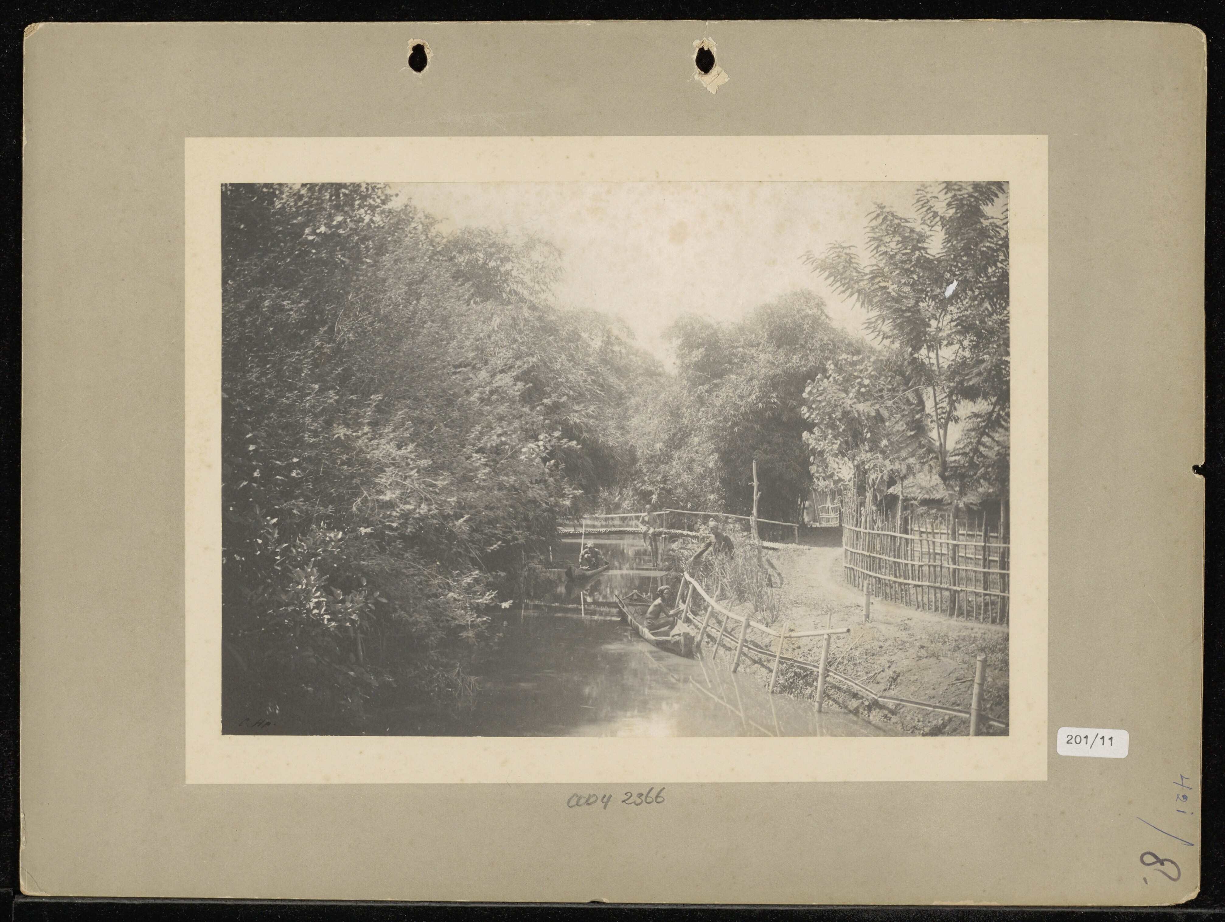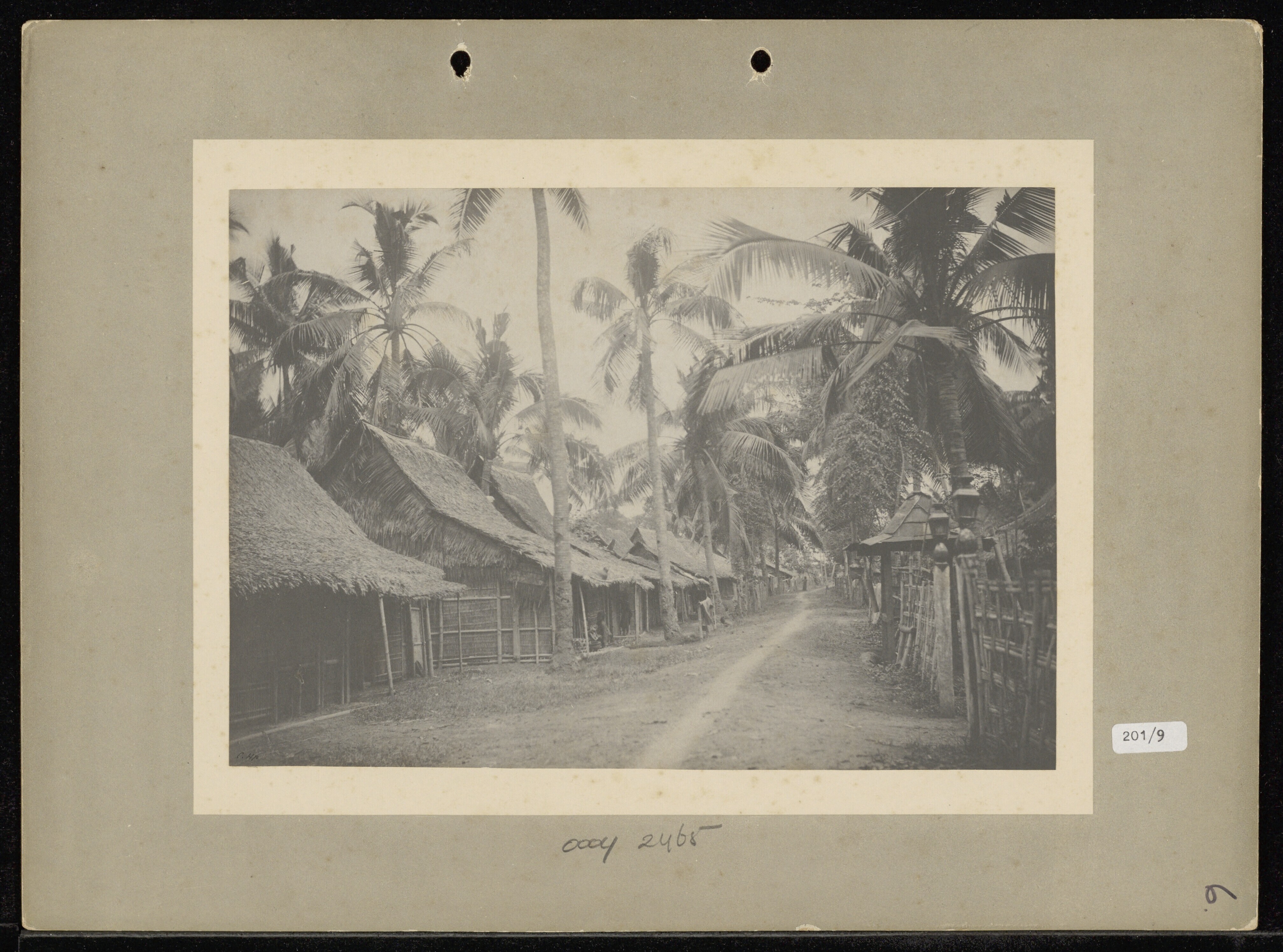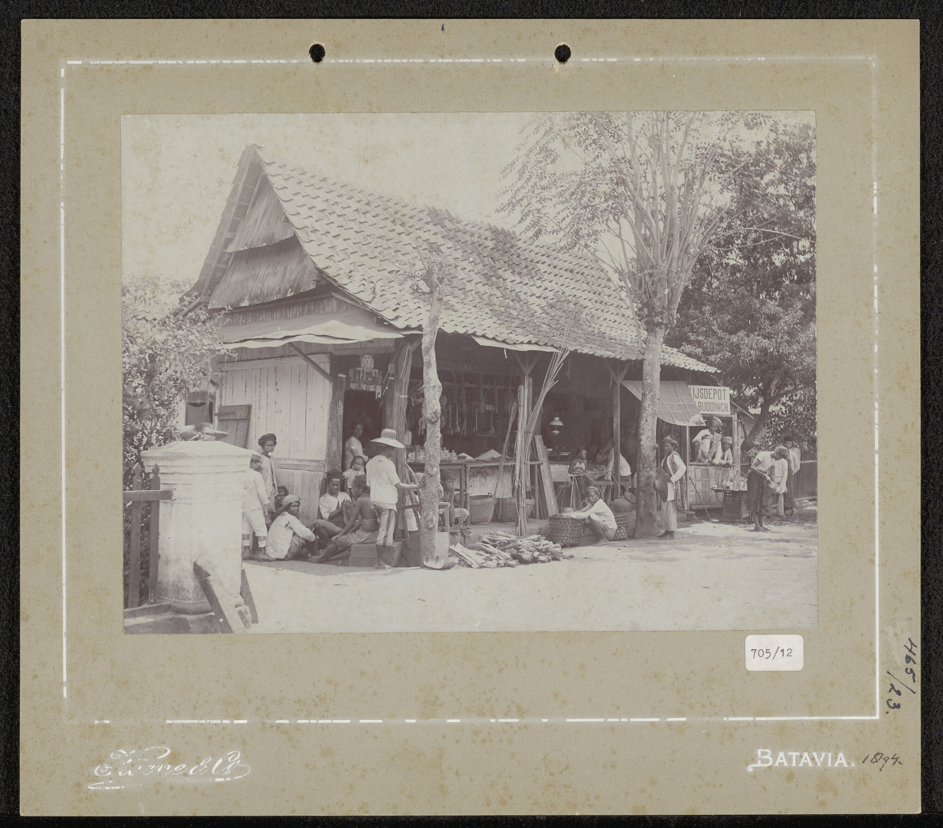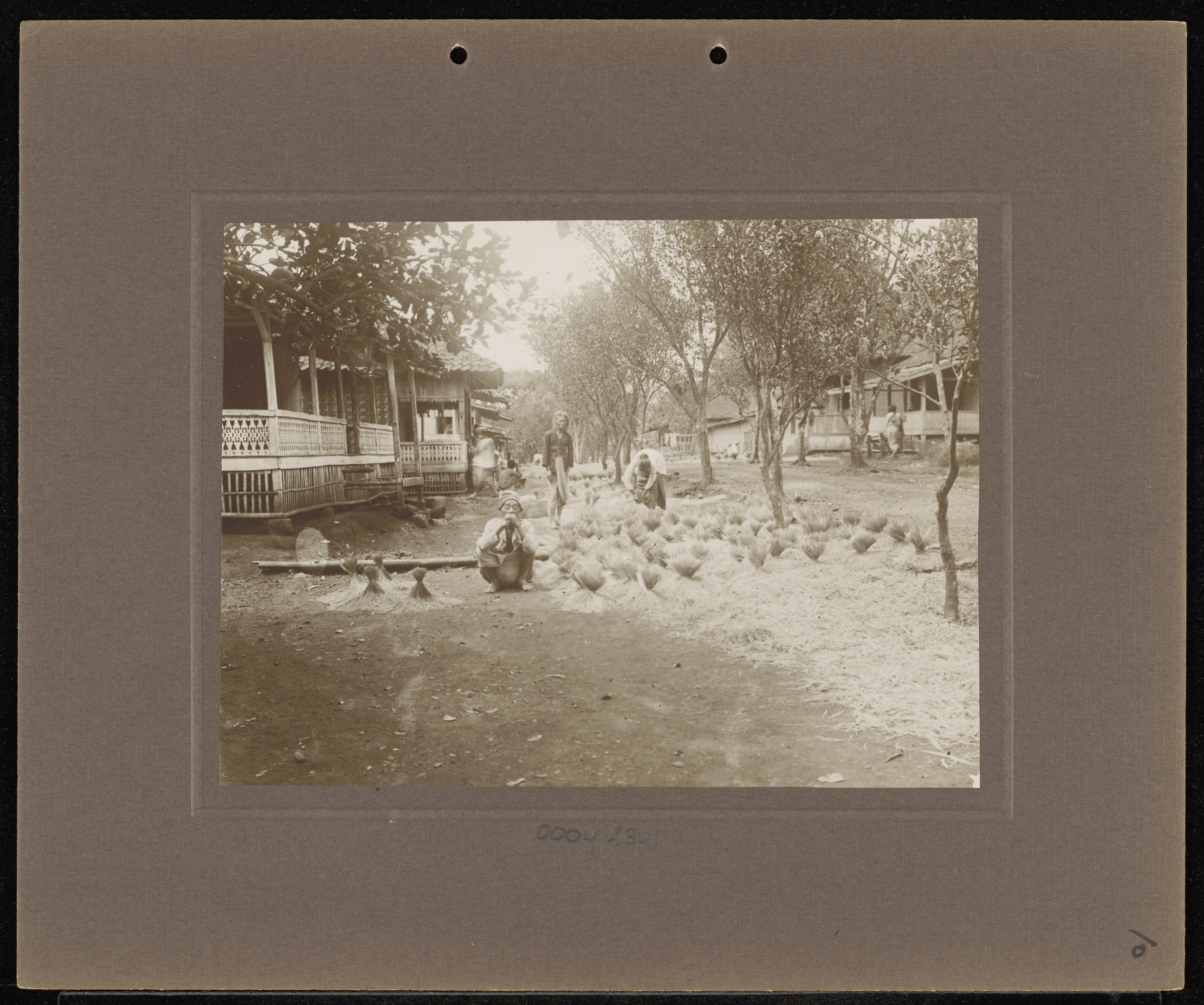 Ingang van een dessa met Javaanse (?) mannen en bote...