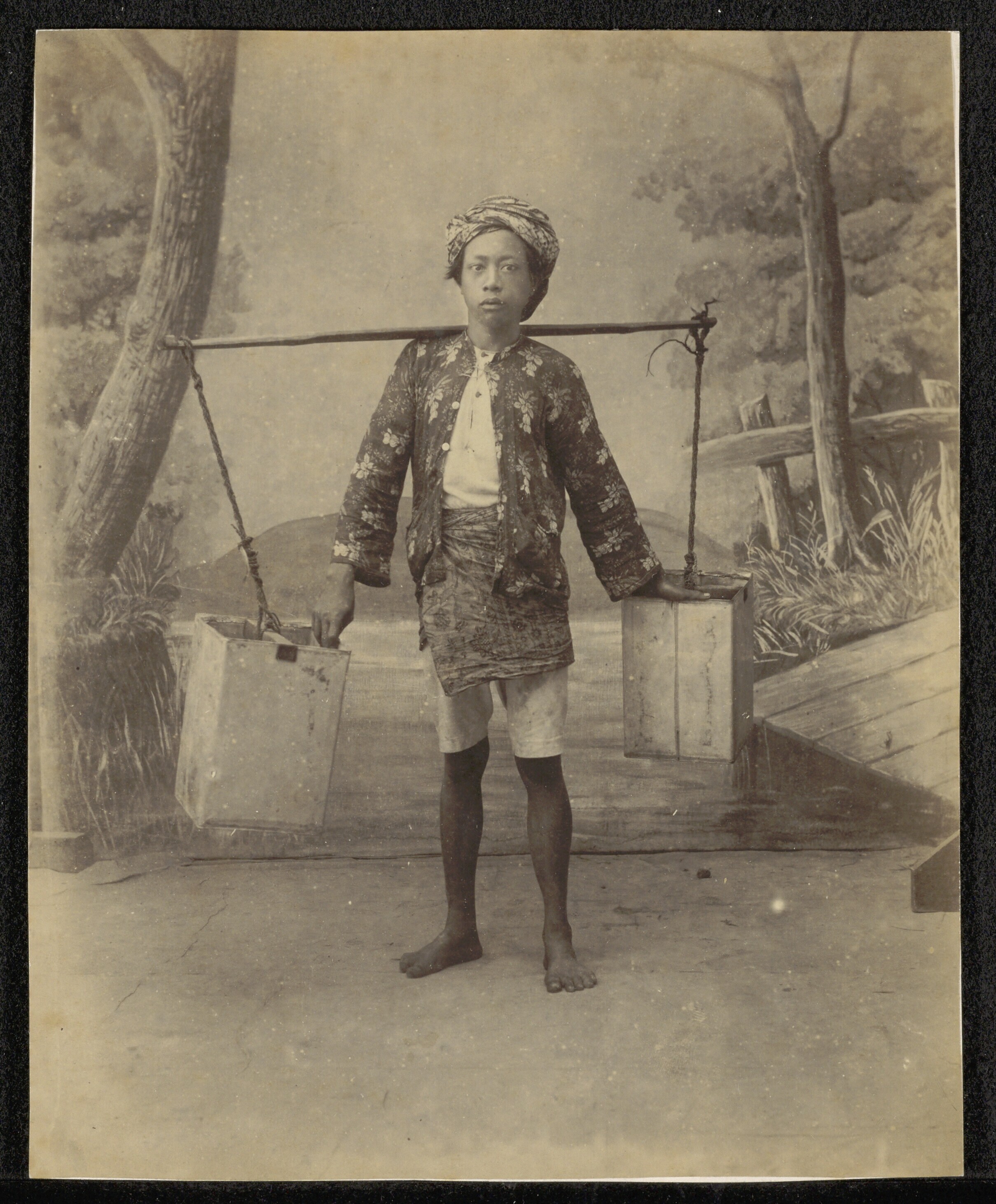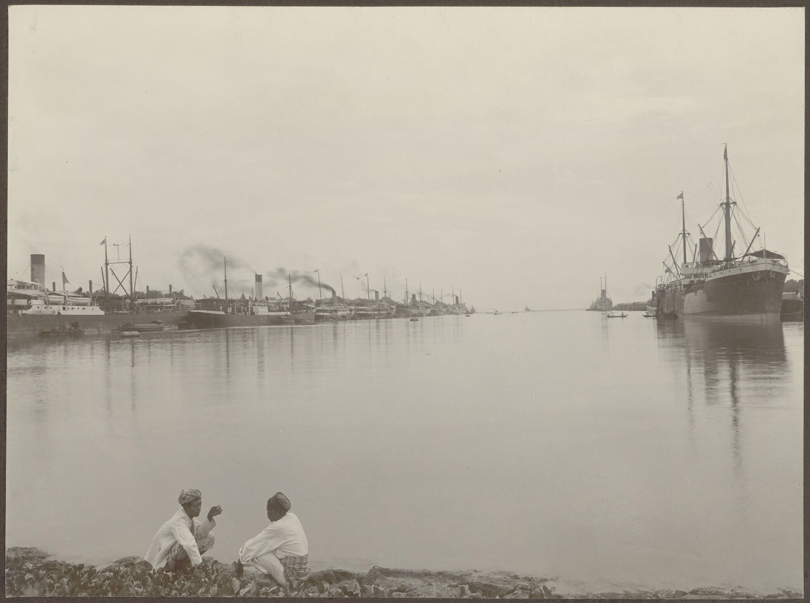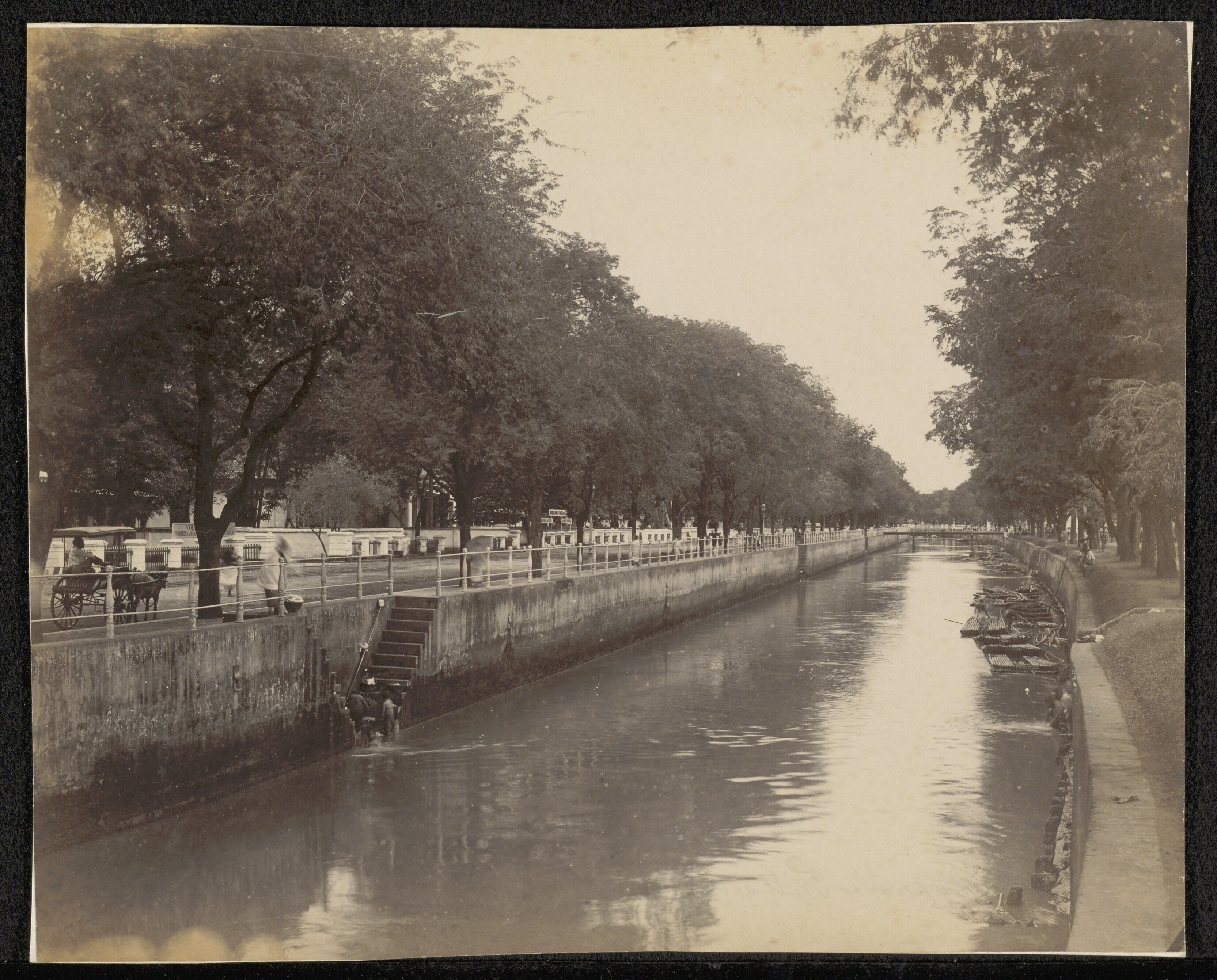 Javanen bij boten in de Kali Bantam, met op de achte...
