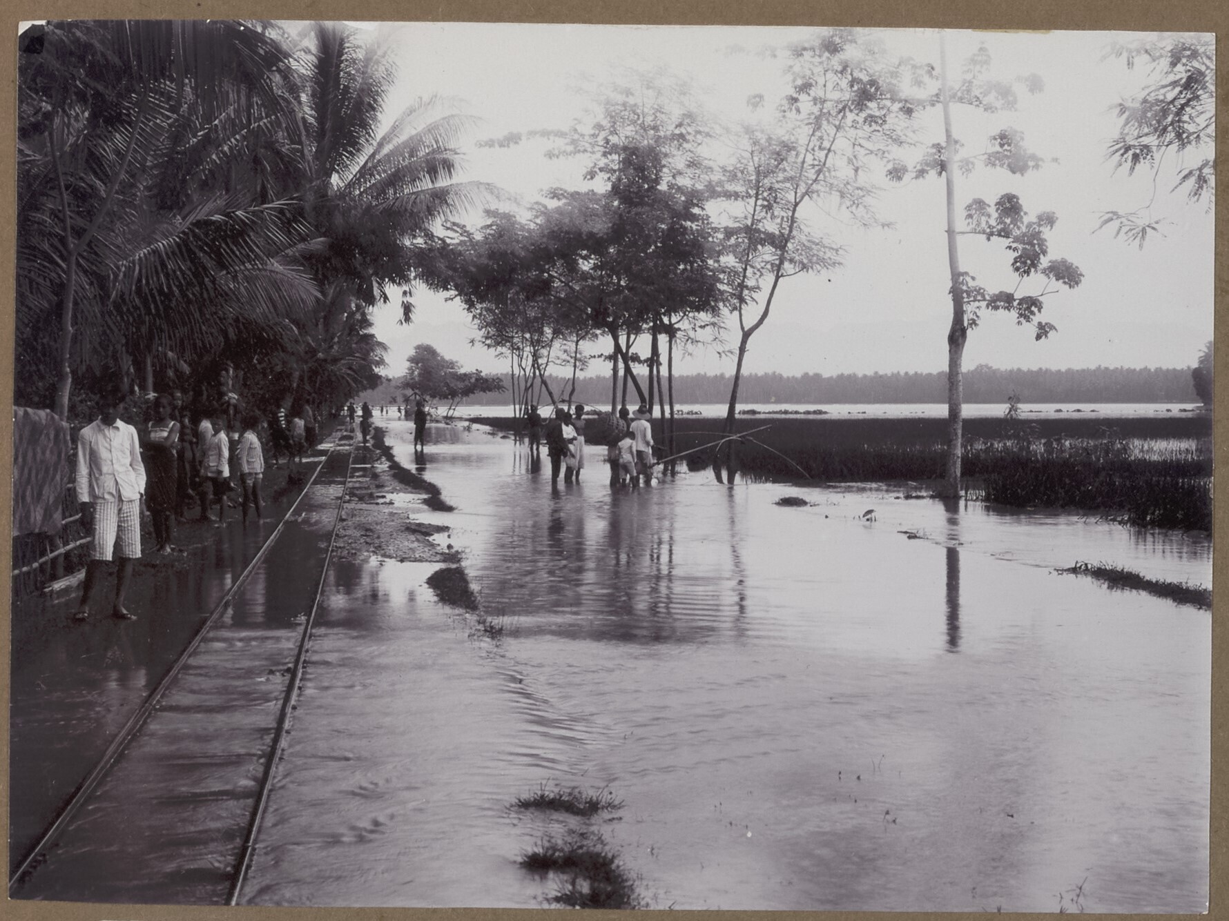 Een groep zwemmende Indonesiërs en langs de kant van...