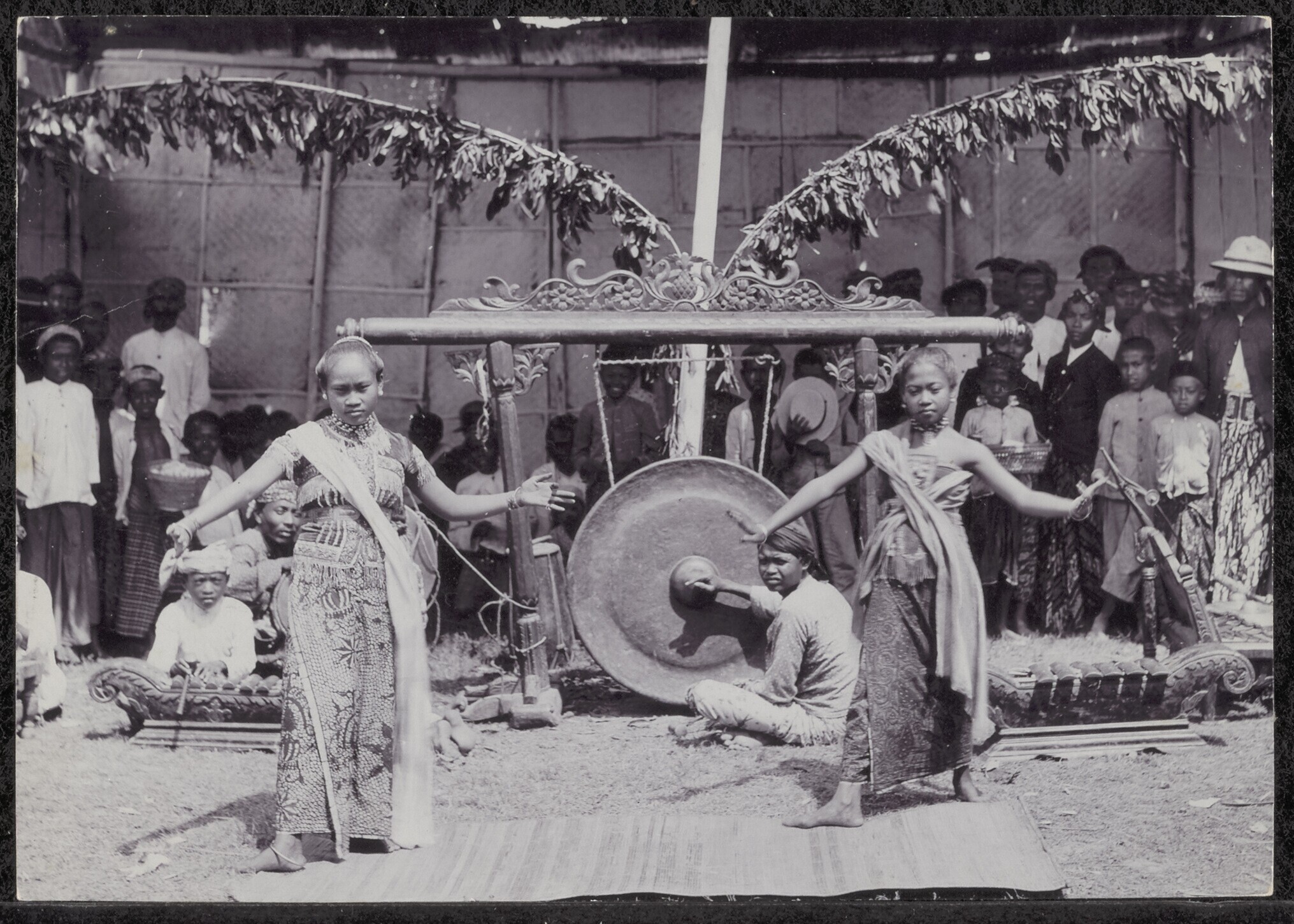 Europeanen poseren temidden van een Javaanse gongspe...