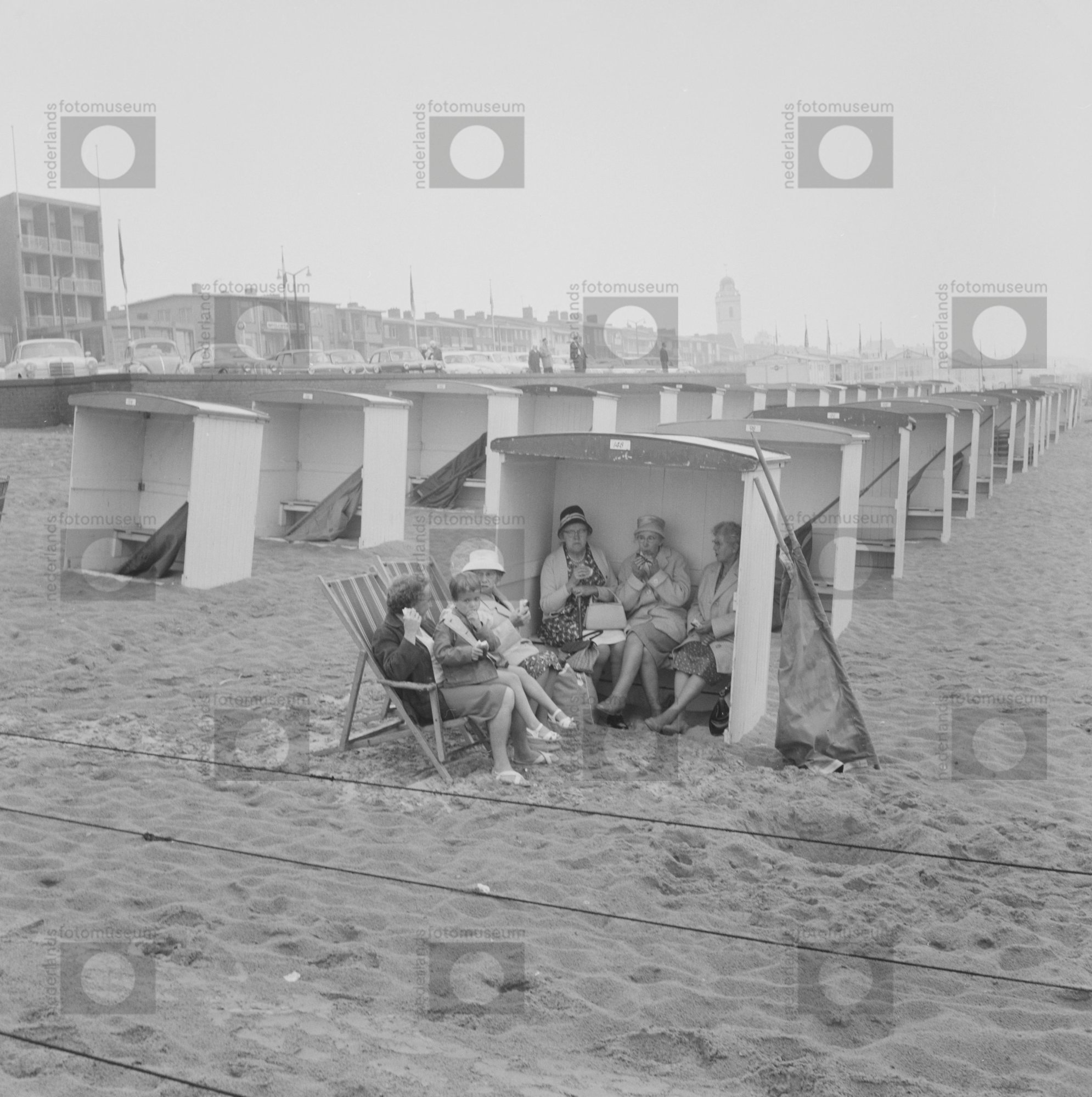Katwijk aan Zee. Dames op het strand zitten in een s...