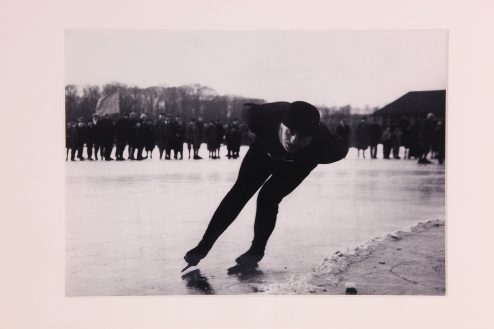 Zwart-witfoto van een lange baan schaatser
