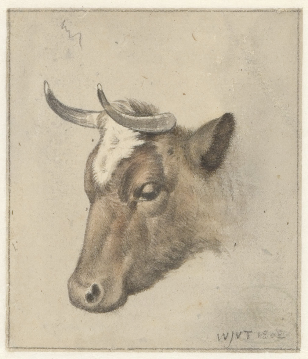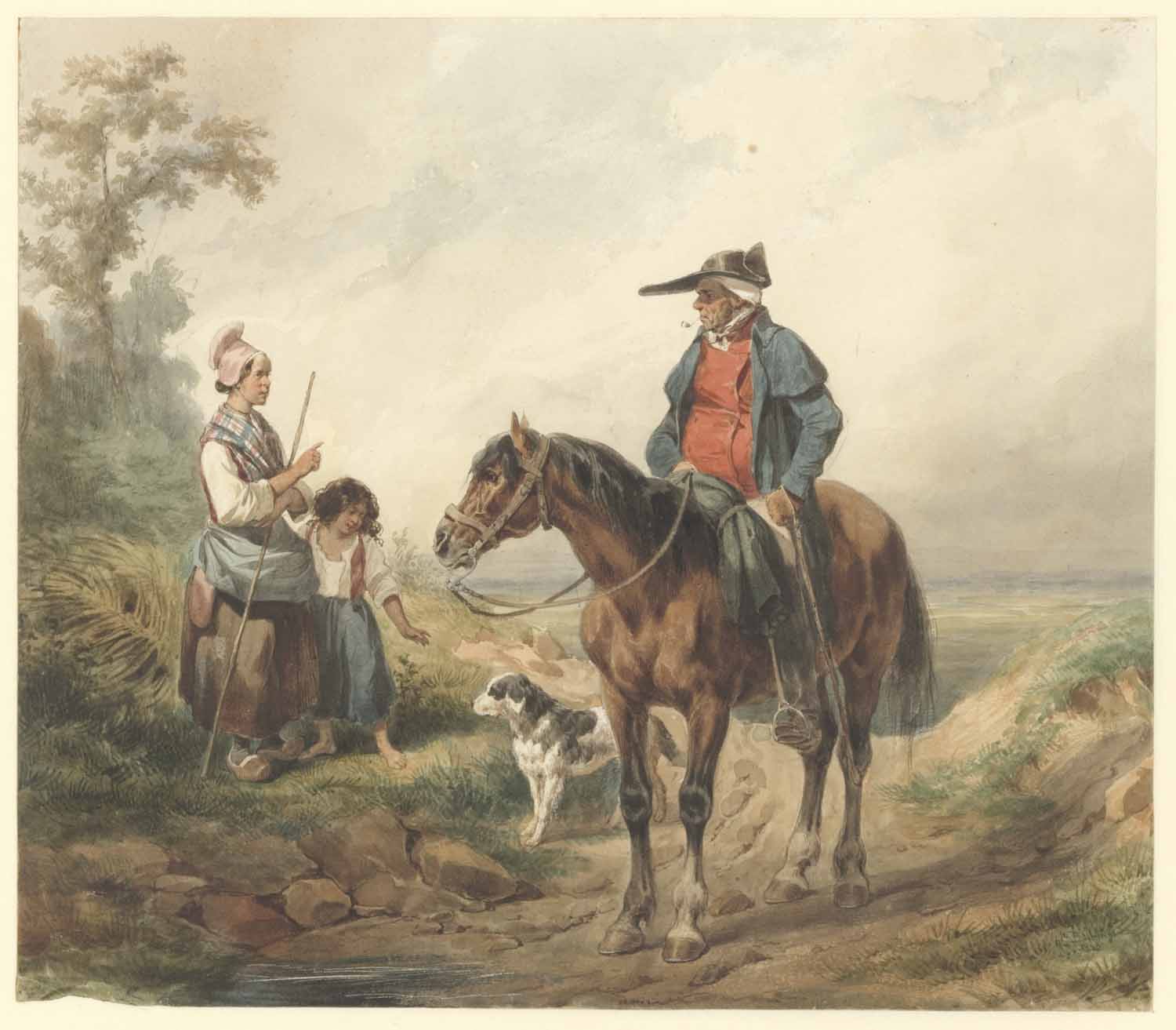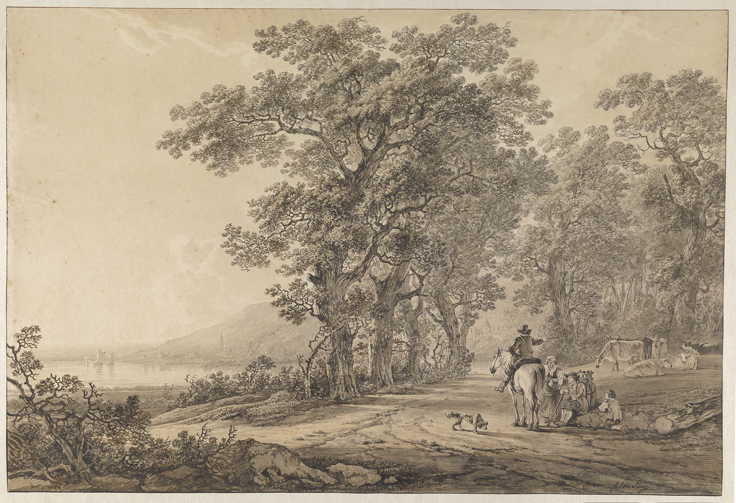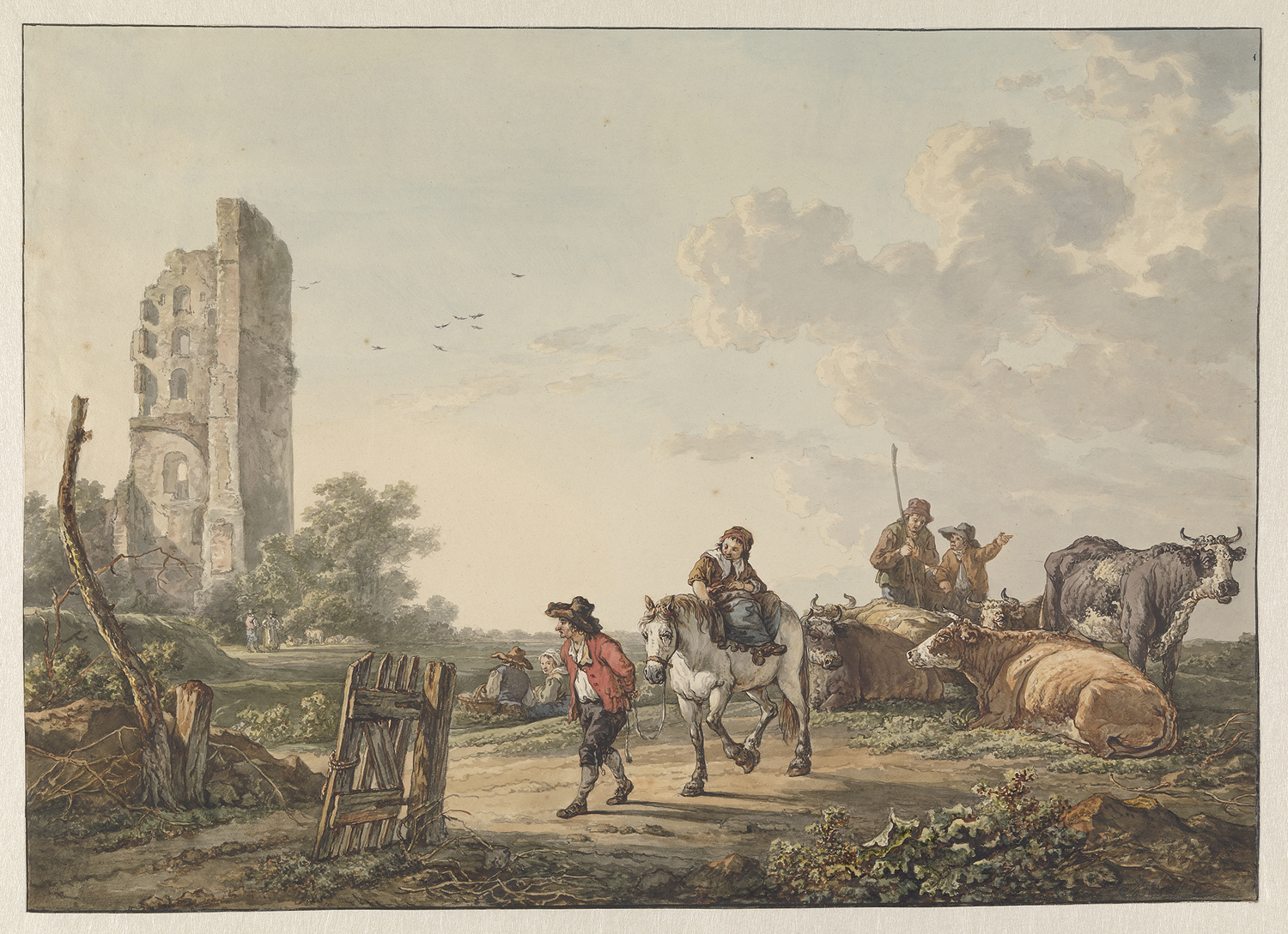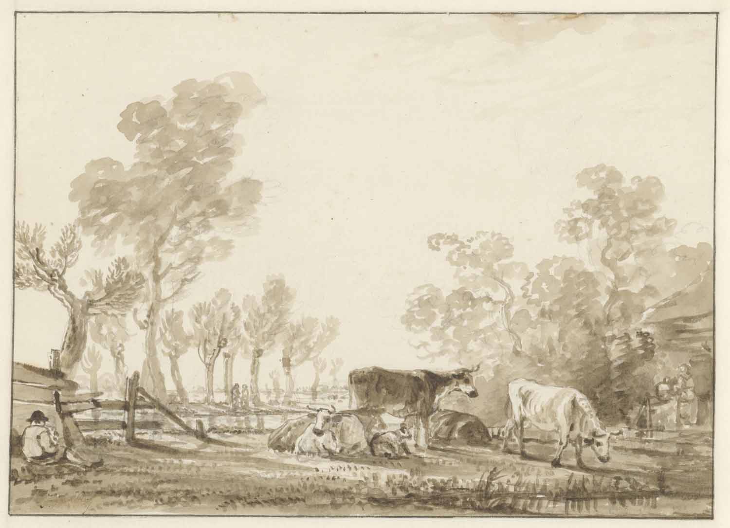 Landlieden bij rustend vee, in een Hollandsch landschap