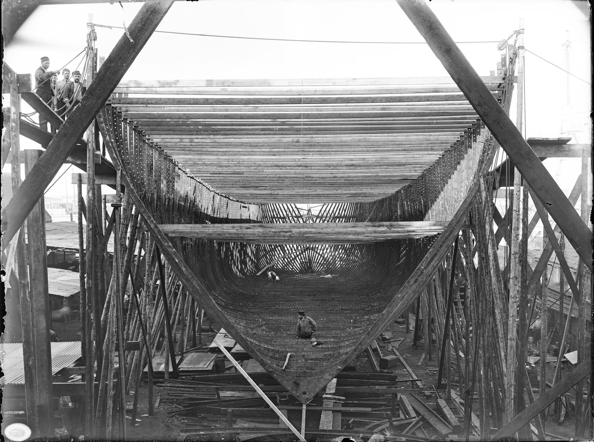 Het stalen barkschip Van Galen in aanbouw op de werf...