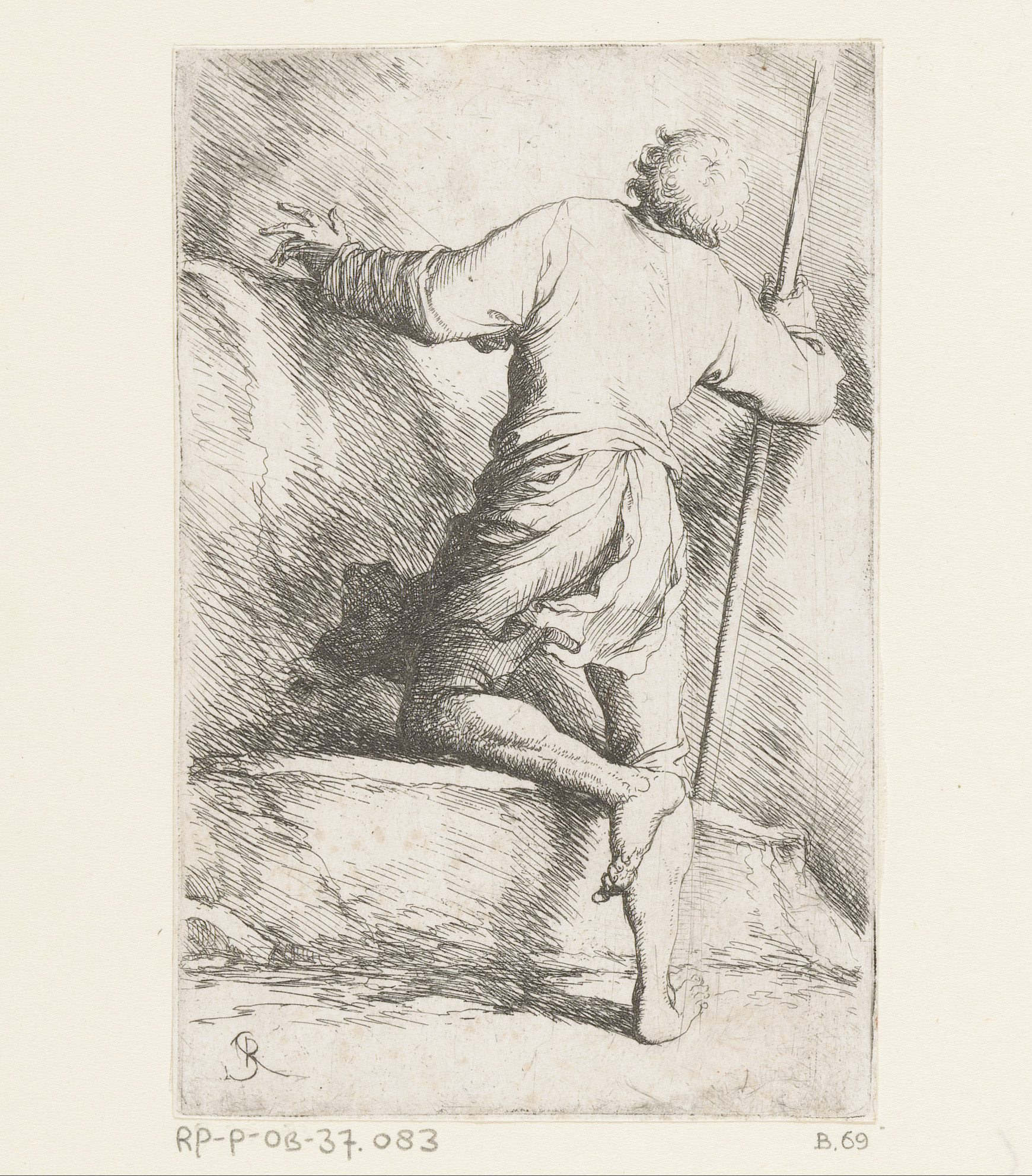 Man met stok op de rug gezien