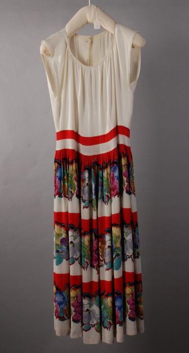 Mouwloze japon van wit crêpe, rokdeel met bloemenran...