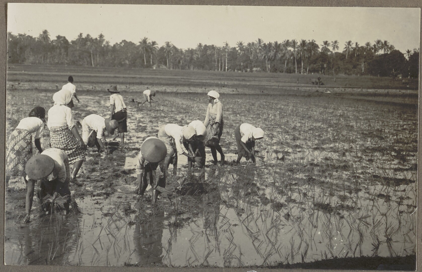 Het uitplanten van de bibit op een sawah op West Java