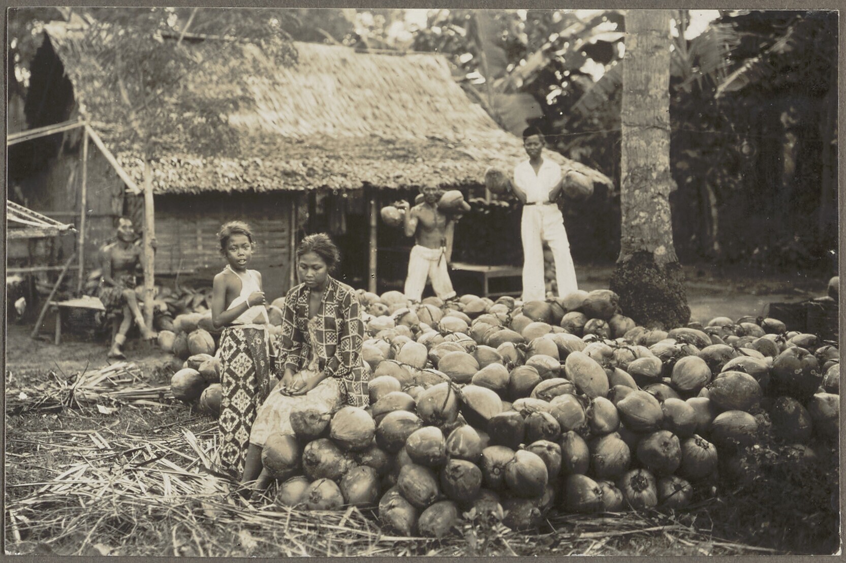 Gerooide kokosnoten worden opgestapeld in een kampon...