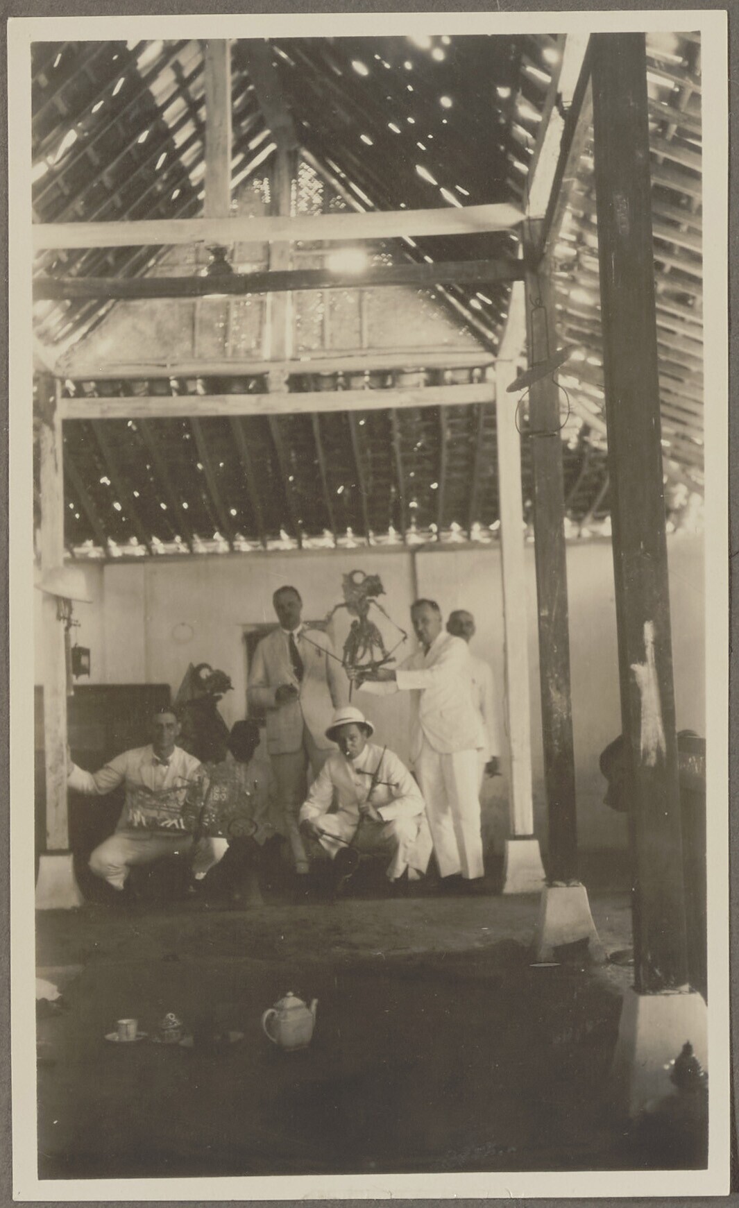 Enkele Europese mannen poseren in een dorpshuis in e...
