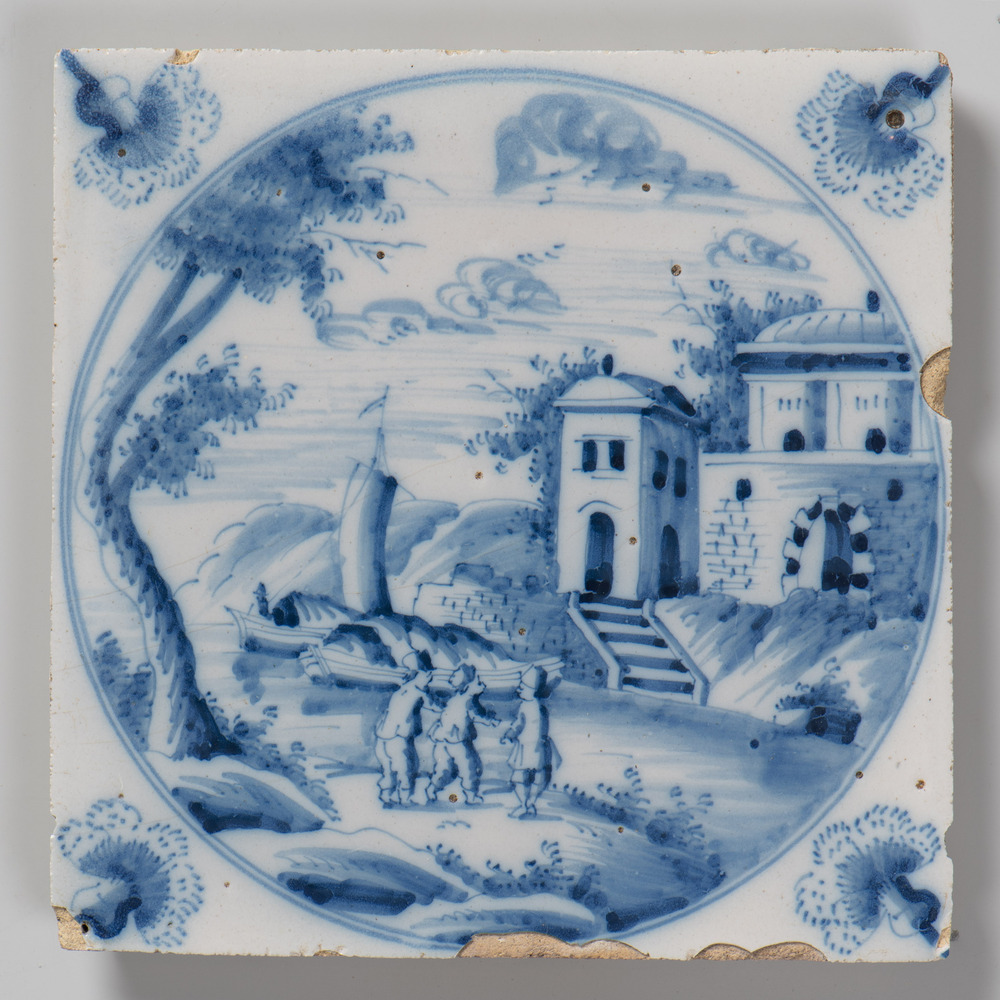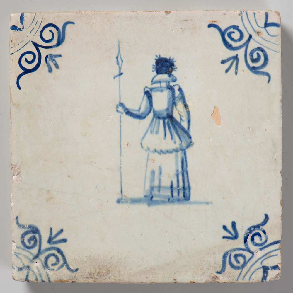 Tegel van aardewerk met tinglazuur, voorstellende: V...