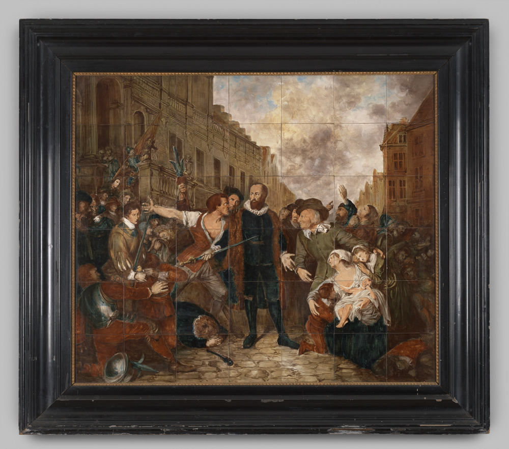 Tegel van keramiek met tinglazuur, voorstellende: De...
