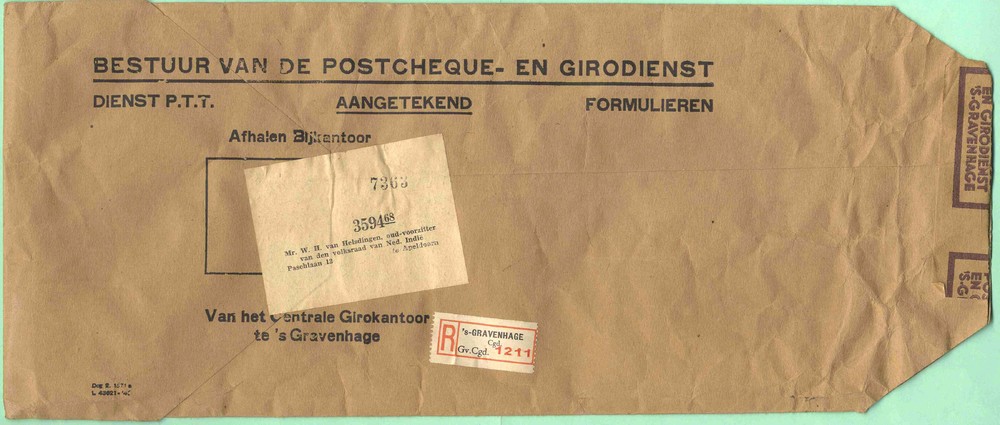 enveloppe geadresseerd aan Mr. W.H. van Helsdingen, ...