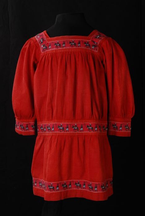 Kinderjurk, schortmodel van rood katoen met sierrand...