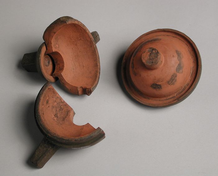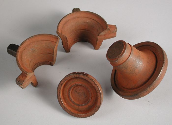 Drie delen van vierdelige bronzen mal voor een bekertje