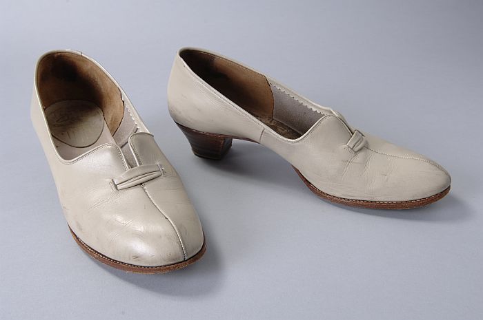 Beige leren damesschoenen, loafer, met klein hakje e...