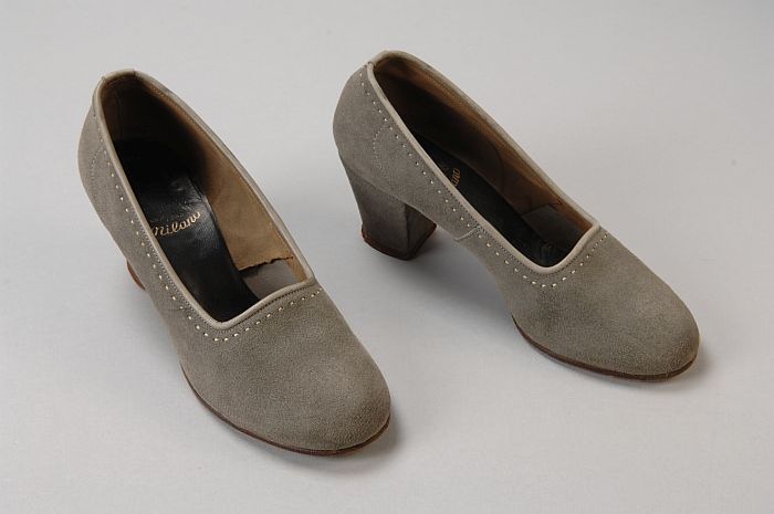 Grijze suède pumps met leren bies en stiksel in lich...
