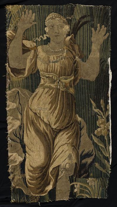 Fragment tapijt in tapisserie met daarop vrouwenfiguur