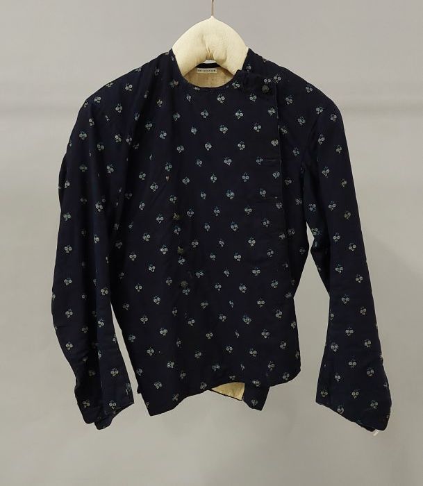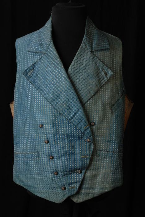 Herenvest, front van blauw-wit damast met brede reve...
