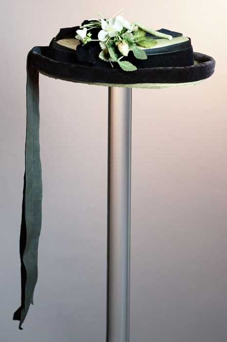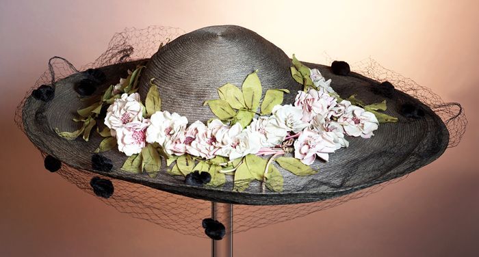 Grote ronde dameshoed met roze bloemen met groene bl...