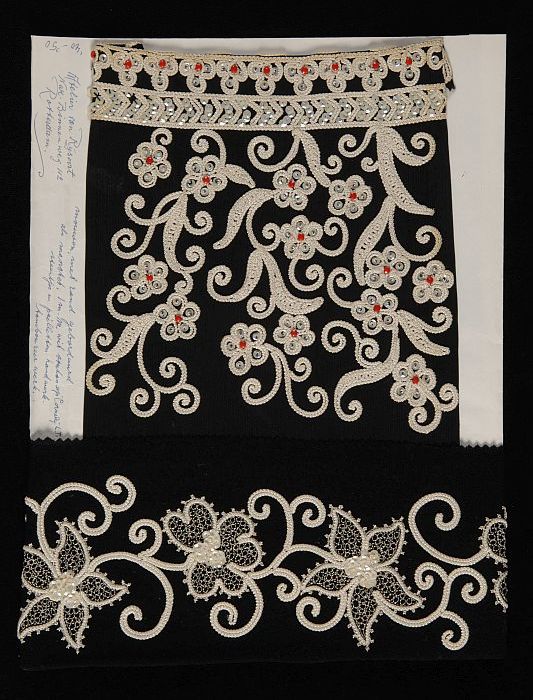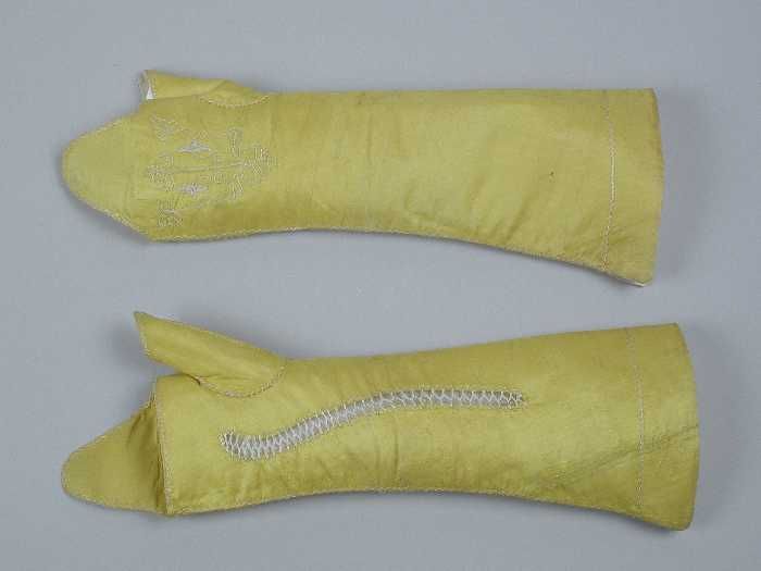 Paar citroengele mitaines met wit borduurwerk en sie...