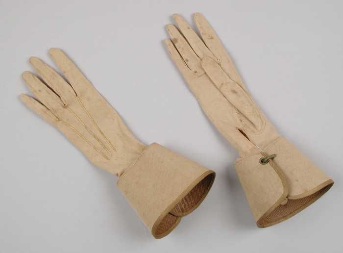 Paar korte dameshandschoenen van dun beige tricot ka...