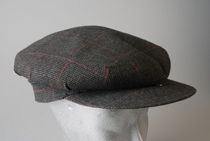 Grote herenpet met klep, grijszwarte wol met rode ru...