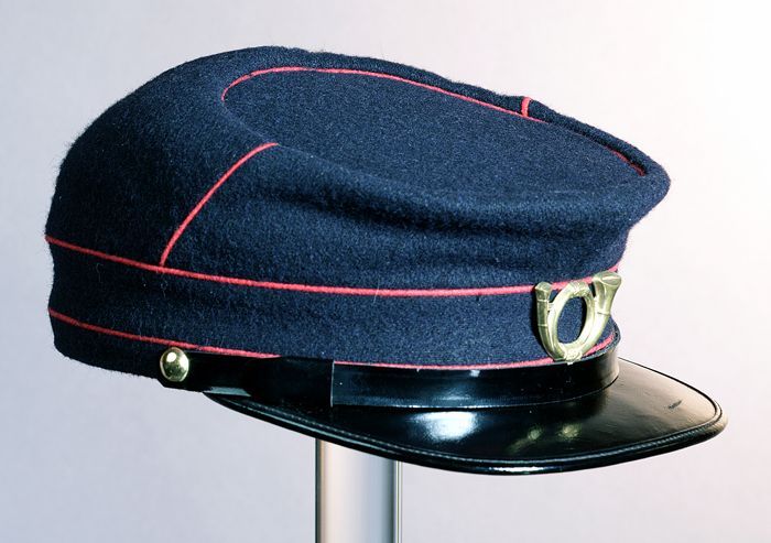 Donkerblauwe uniformpet van postbode met rode biezen...