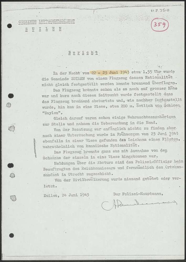 Rapport Gemeinde Luftschutzdienst Zuilen 24 juni 1943.